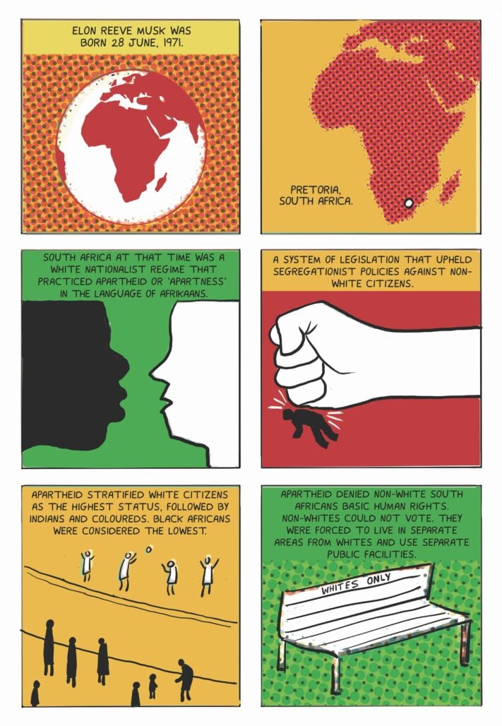 The cartoonist’s signature linework and use of solid colors keeps the visuals light on detail so that the text-heavy pages flow with more ease. It also lets readers fill in the panels with their own images of Musk and the other figures he deals with. There’s an abundance of these pictures online, most notably in the form of memes and reels. It’s pretty hard not to come across this man’s face on social media or any other type of visual media. As such, the art invites just enough interpretation as the narrative unfolds so we can fit our own appreciation of Musk as we read.