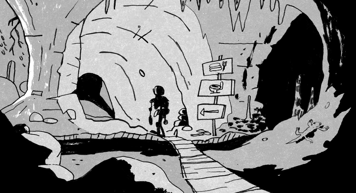 Syd Madia’s Hero Cave is one of the many mushrooms to sprout from the fertile soil of the dark fantasy genre in the wake of FromSoft’s pandemic-era success. This lean but powerful graphic novella takes its visual inspiration from dungeon exploration games filled with twisting underground corridors, hooded necromancers, and hordes of sword-wielding skeletons. Despite its spooky imagery and respect for the unapologetically morbid tone of the dark fantasy genre, Hero Cave is a clever comedy that confronts a cultural sense of malaise and offers not just a glimmer of hope, but an epic explosion of joy.
