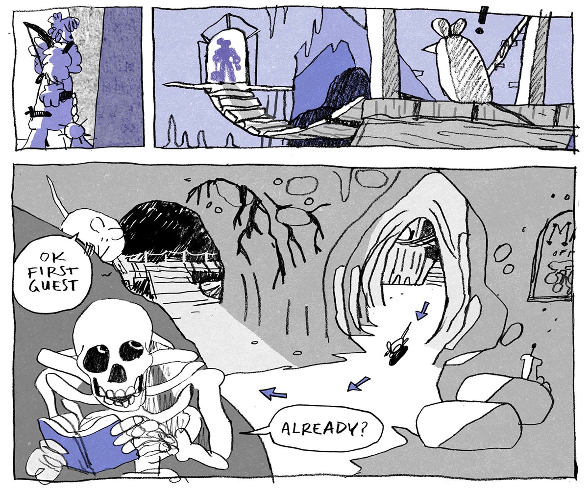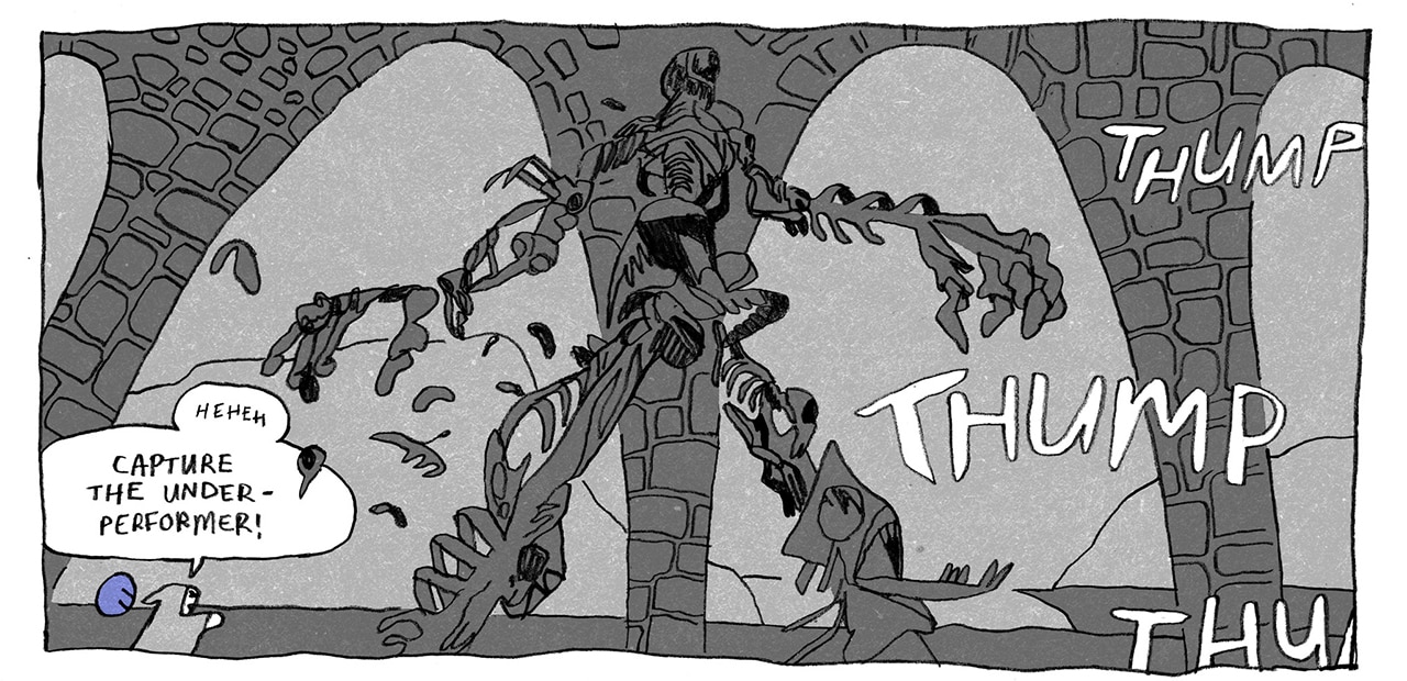 They’ve been doing this job for hundreds of years, and the time has finally come for them to meet the necromancer who manages the dungeon for a dreaded performance review. The dungeon master is as banally evil as any boss, and he’s not the least bit interested in the welfare of his workers. When he reveals the retirement plan he envisions for the skeleton, it becomes clear that they will never get any rest or reward for their employment, not even in (a second) death.