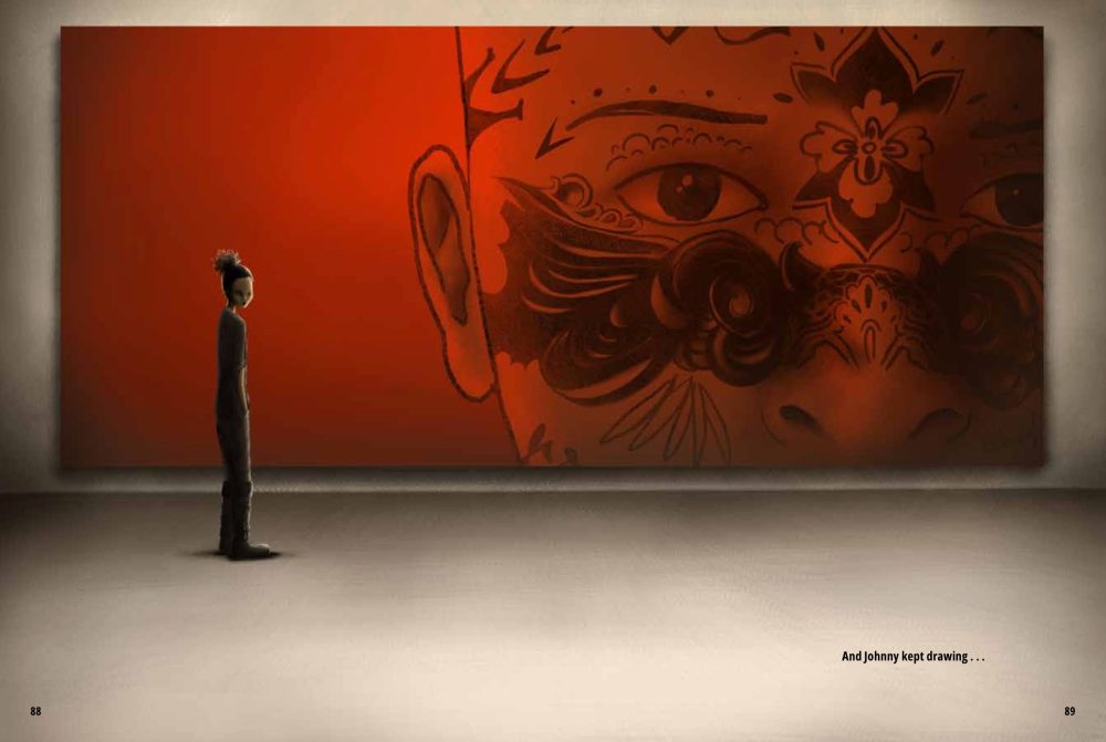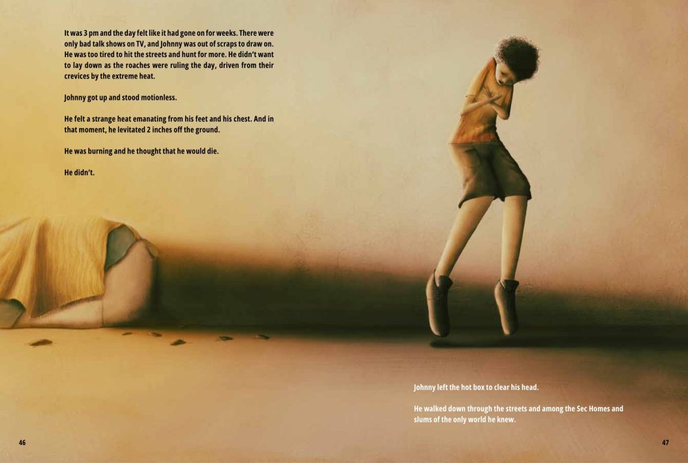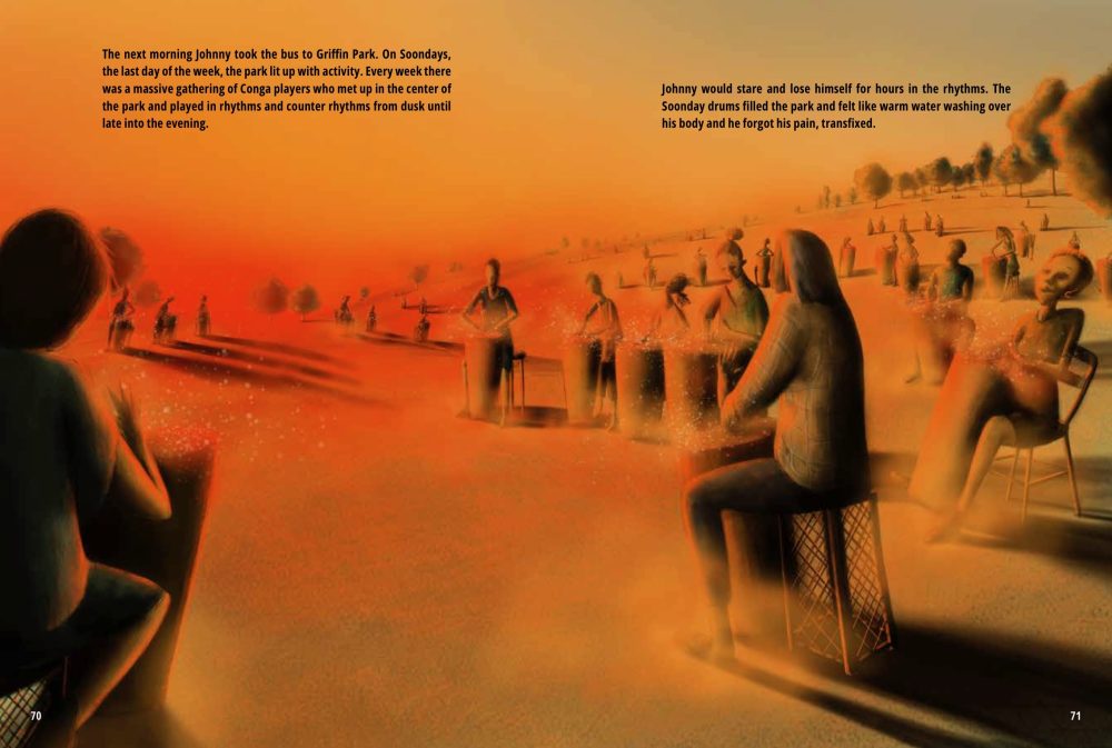 The book, like Johnny, is a hybrid mashup, an impassioned statement on race, culture, society, art, education, and the environment. This graphic novel gumbo blends social commentary with haunting visuals, asking why can’t the world be fixed without resorting to military service or gentrification, without the soapbox.