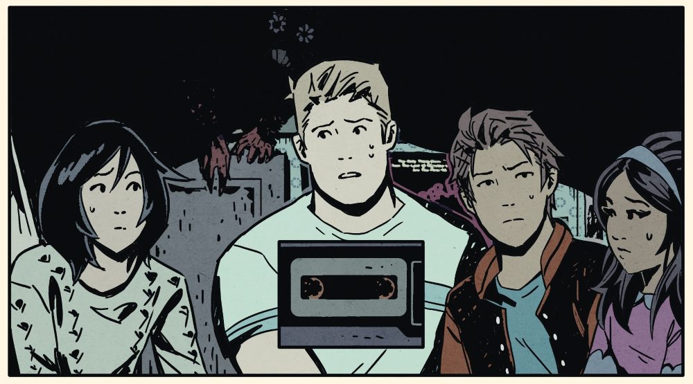 One such moment being the title drop. Midway through the third chapter, our characters end up in the age old horror situation of finding a tape recording with the voice of a dead person on it. The scene begins with rather cool blues and limited backgrounds. Panel wise, the page is depicted in a rather controlled nine panel grid of seven panels. The first six panels are standard blocks of rows of three panels while the final panel is a combined row.