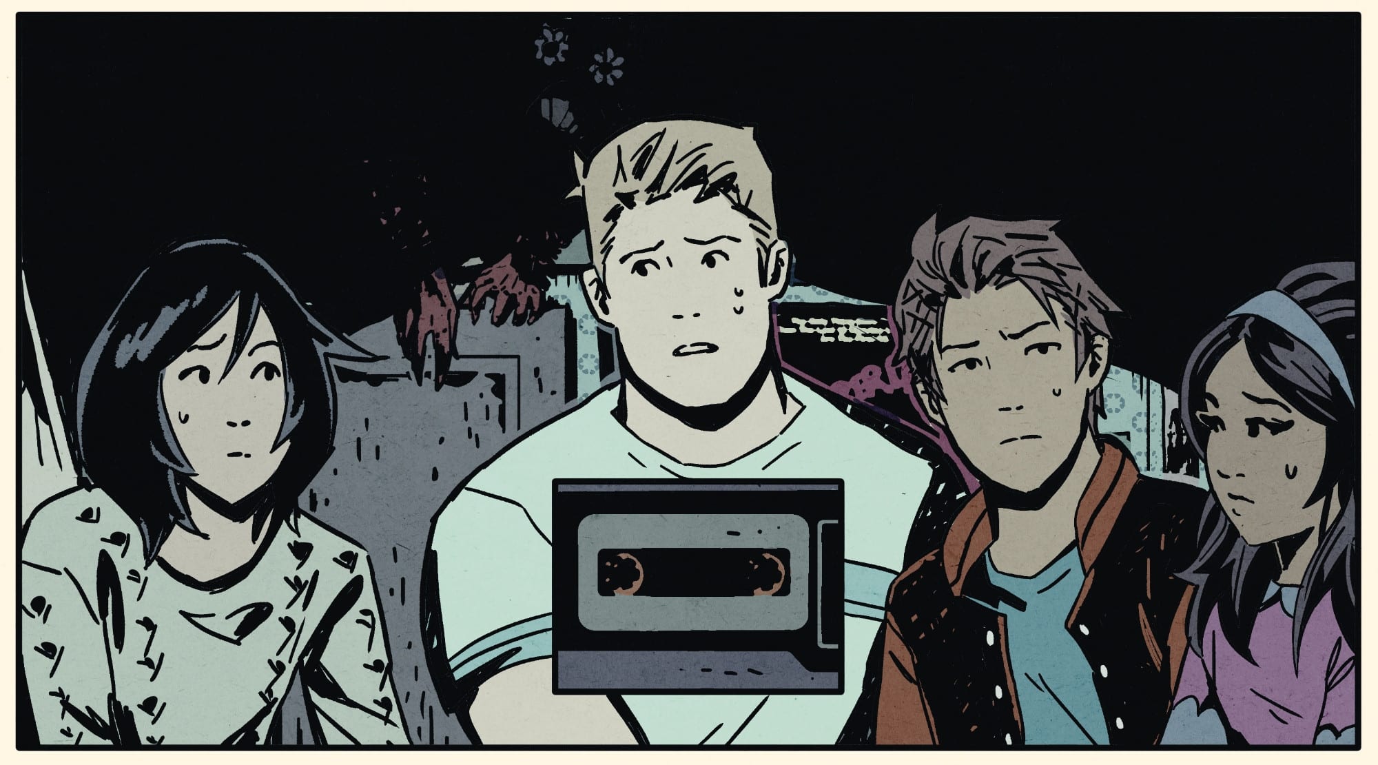 One such moment being the title drop. Midway through the third chapter, our characters end up in the age old horror situation of finding a tape recording with the voice of a dead person on it. The scene begins with rather cool blues and limited backgrounds. Panel wise, the page is depicted in a rather controlled nine panel grid of seven panels. The first six panels are standard blocks of rows of three panels while the final panel is a combined row.