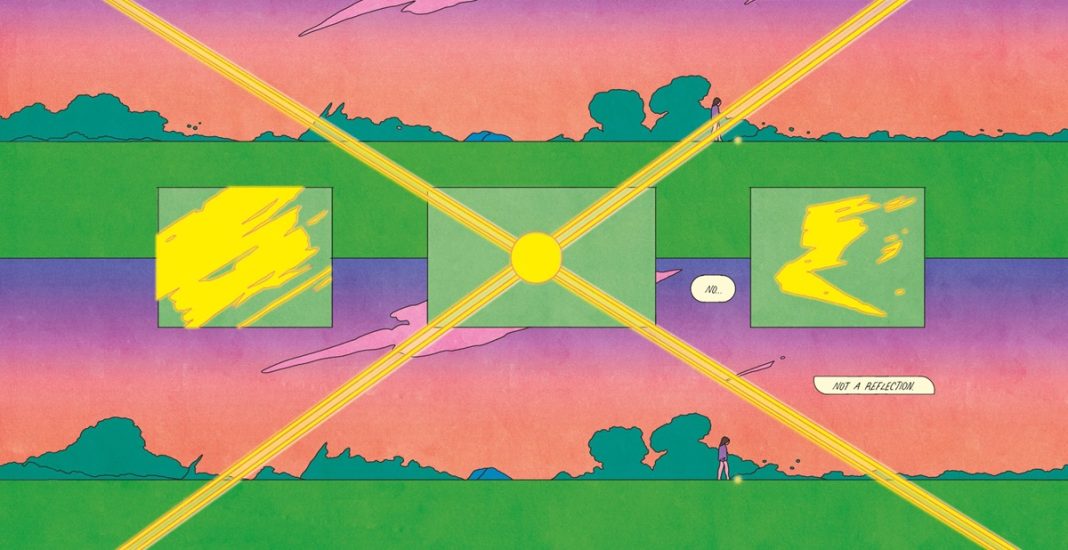 Do you remember when you were a kid, and you’d open a new pack of construction paper? You could flip through it and see a very specific rainbow of familiar colors, shades that seemed specific to construction paper. Doing that was common for me as a child, but I hadn’t thought of the memory or the sensation in many, many years — until I read the new English translation of Spanish artist Maria Medem’s graphic novel, Land of Mirrors, a bright fine art item that will draw you in with the pure gorgeousness of its design.
