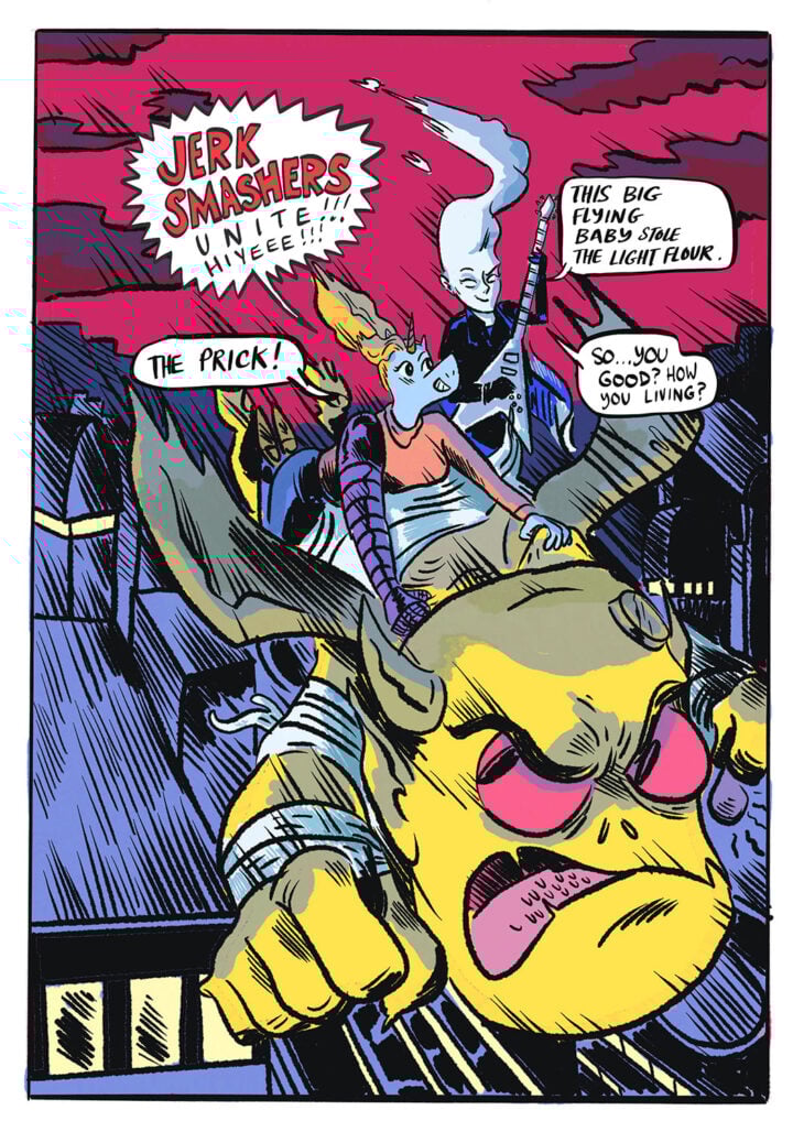 And really, this new volume picks up right where the first left off. Within 20 pages, Lisa and Ghost Guitar (GG, familiarly) are fighting a giant cherub demon baby who stole some flour from the aforementioned bakery, and we off we go.