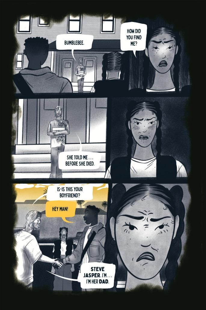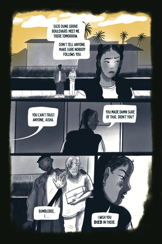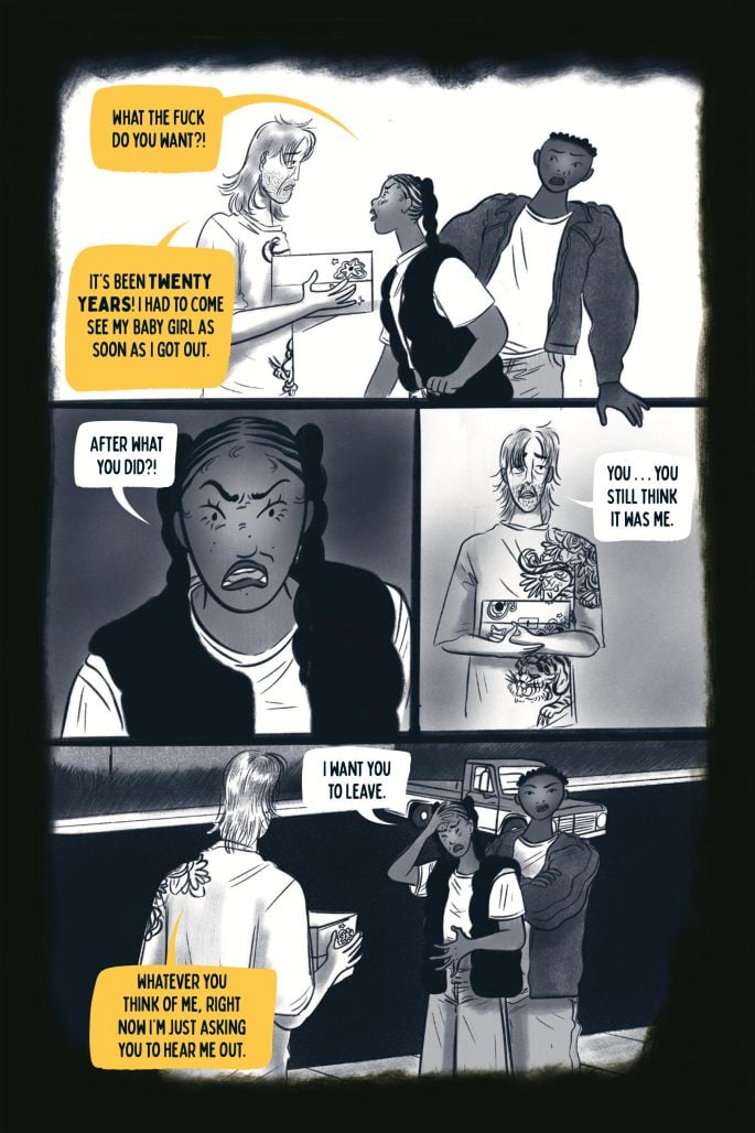 Joining Daniels on this project is debut graphic novelist Sucre, who does wonderful work, all of it in black-and-white greyscale with splashes of gold, befitting of its swampy sun-drenched setting. Sucre’s style of cartooning is spare but crystal clear with its visual storytelling, and in the course of this 240 pages, it continues to evolve, sharpening as the story continues and approaches its finale.
