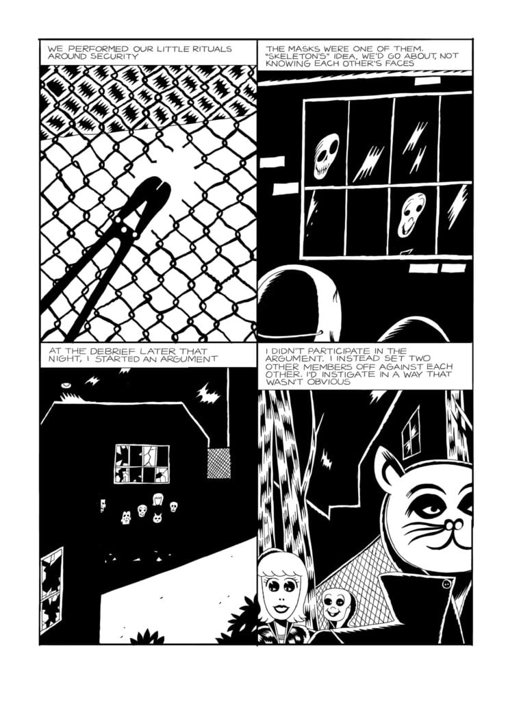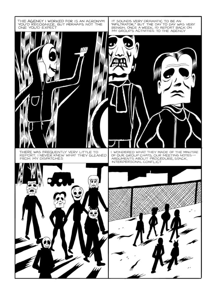This new short story collection – DeForge’s second – is filled with diversions and astute thoughts on mass culture and surveillance societies, and it’s packed with eye-meltingly bizarre settings; take, for one example, an apparent orgy between all the Universal Monsters. Frankenstein’s Monster, you may be happy to hear, has a huge metal screw for a penis. The interactions, if you want to call them that, carry serious conversation but are presented vertiginously, in contained but twisting, upturning panels that add to the sense of unease. There’s an inescapable sense of “Whaaaa?”.