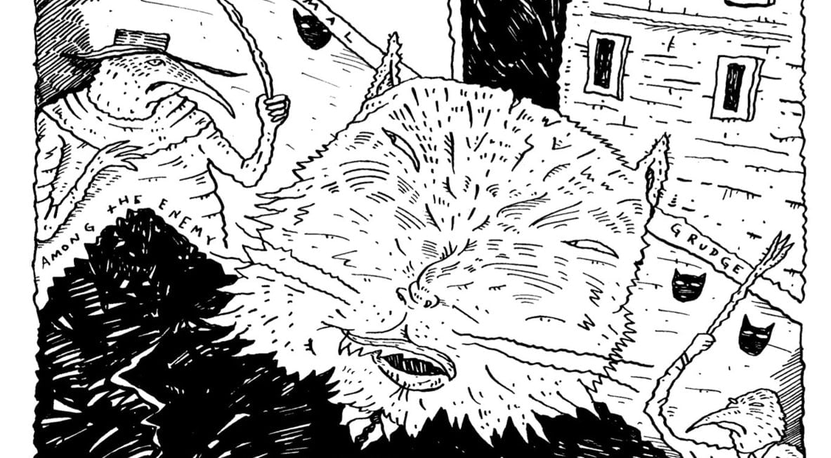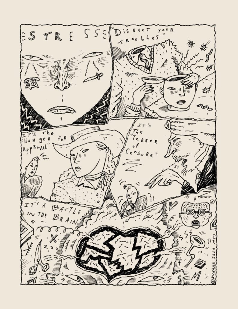 But these pieces also stand on their own as fascinating cartooning, independent of any knowledge of Sala or his other work. Some years ago, I was visiting friends and family in my hometown near Chicago, and we took a trip to the Art Institute (arguably the country’s finest art museum). On display was the work of the Chicago fine-art comics collective, The Hairy Who. Each piece was rough-hewn but layered, moving but unpretentious, and they wore their influences proudly and openly.