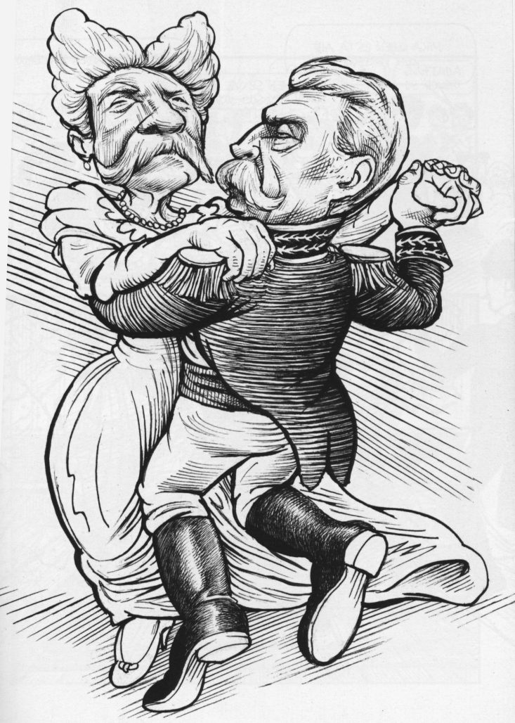 Posada also illustrated a notorious sex scandal. It was the talk of every Mexican household, including the Presidential Palace. At 3 a.m. on Nov 18, 1901, a Sunday morning, Mexico City Police raided a private dance party. Forty-one men were arrested, nearly half of them were dressed as women, complete with false breasts and full evening gowns. It was widely known that the police escorted a 42nd partygoer, a V.I.P., to safety moments before the raid. That 42nd partygoer was President Diaz’s son-in-law. Posada’s drawings of the dancers in drag with handlebar mustaches went viral.