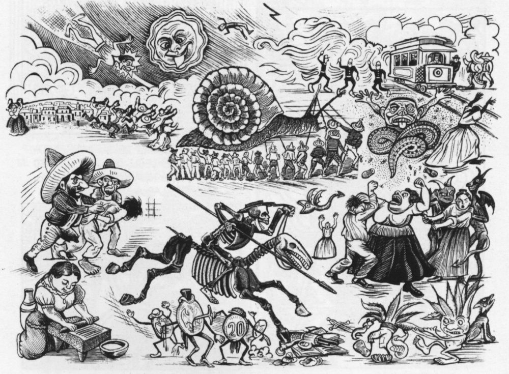 The editor, Venegas Arroyo, was clever enough to refrain from naming the 42nd guest. The headline over Posada’s print was Baile de 41, which translates to The Dance of 41. That odd number was enough to signal to the President that they had uncovered embarrassing information. While other Mexican journalists were jailed by the dictator Díaz, Posada and Venegas Arroyo managed to keep their presses rolling.