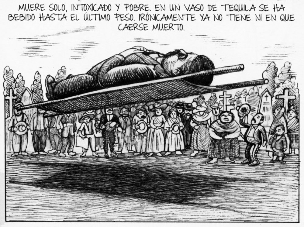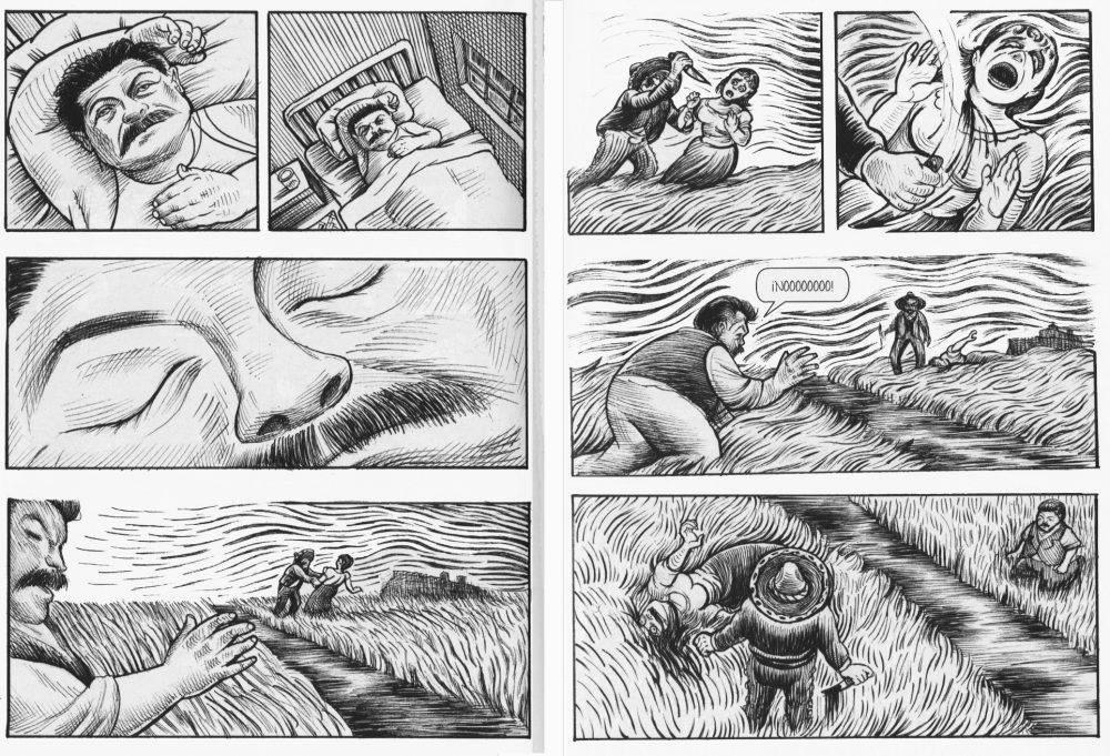 His homage to Posada ramps into high gear with this powerful graphic novel. Ironically, though Posada created thousands of printed images, very few images of the man himself exist. Two small photos and a Leopoldo Méndez woodcut of Posada’s studio make for a meager visual reference archive.