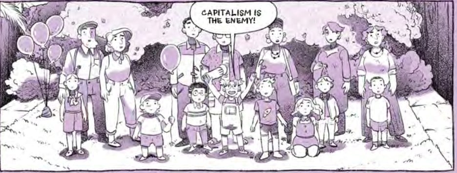 Additionally, the limited color pallet, constantly changing with each chapter, provides a mood of uncertainty. Never going for primary shades of reds, yellows, and blues, the effect highlights the transitional nature of our various characters. (And when the shades are that hue, it’s slightly off, never a pure primary shade.) Additionally, Goux’s artstyle has a slightly cartoony edge to it. Not in the sense of unrealty visible within a Looney Tunes cartoon, but rather the simplified features of an old Saturday Morning Cartoon. Characters have dots for eyes, standard clothing and hair styles, and a general vibe that doesn’t fully change, even as their personalites clearly are.