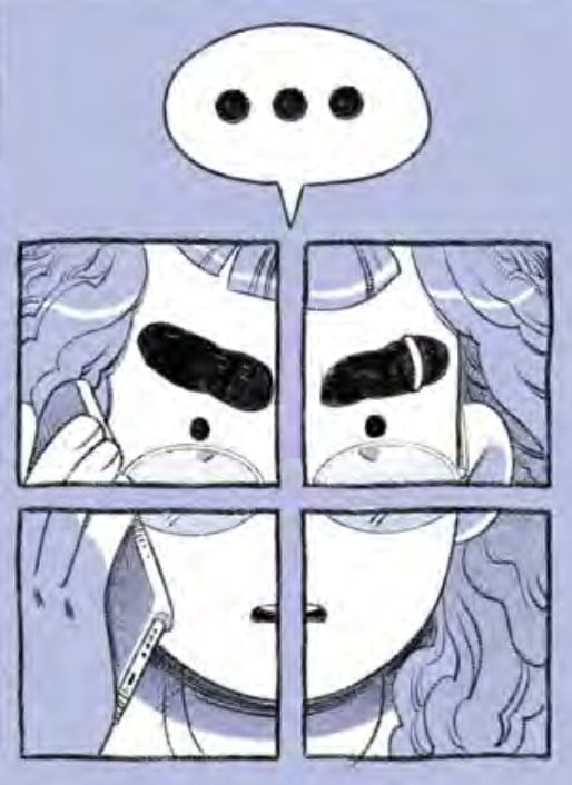 Visually, this is depicted through Nicole Goux’s artwork. Each page is separated into a number of rectangular panels of varying sizes, often structured into grids. While on the surface, this might imply a degree of control on the behalf of the characters, Goux will frequently shrink the panel sizes to show small, intimate moments or split up a character’s face.