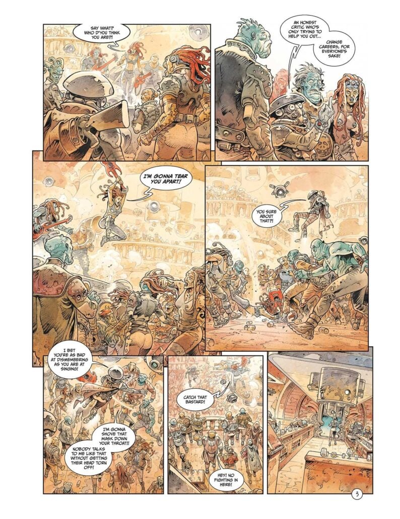 The credit for the script there goes to Sylvain Runberg, whose crisp, often-funny dialouge gets a translation in this edition from Dan Christensen. And the end product is a book filled with pristine banter that feels natural, but also keeps the reader oriented to the complexities of the plot.