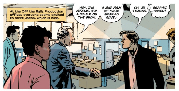 One of my favorite bits in the whole book is when someone refers to Jacob’s strips as a “graphic novel,” to his utter confusion about conflating the two formats. I’ve often said anyone in Hollywood who claims they’ve read the comics they’re adapting is usually lying, and you can almost always tell because they’ll say “the comic books” or “graphic novels” instead of “comics,” “issues,” “trades,” “strips,” or whatever would actually be appropriate for the material. It’s a small thing, but you can’t unsee it after you notice. That attention to detail, or lack thereof, that level of dismissiveness towards the medium emanates from the Hollywood side of this story and leads to all the best elements of The Knives.