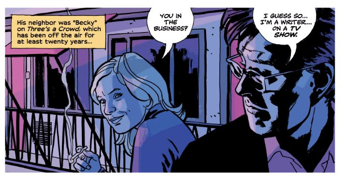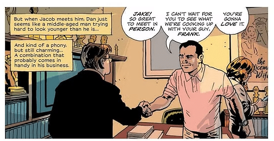 Indeed, there’s quite a bit of precedent here for that connection as well. The early history of Hollywood and comics, DC in particular, is littered with tales of the mob upholding studios, wrangling in creatives, and suppressing union and organizing efforts. It’s a fascinating connection and one where Brubaker’s subtext often feels just like text. Who do you want to find yourself locked in a room with: Dan, the man who will steal all your hopes and dreams, or Brandon Hyde who might rough you up and also steal all your hopes and dreams? Depending on whether you’re Jacob or Angie, it almost doesn’t make a difference.