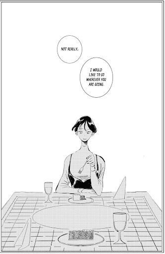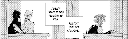 Furthermore, there’s how the panels are shaded. Nguyen has the table, the floor, and the majority of Alea shaded with small dots. This creates a shared reality between these aspects. By contrast, Kait is shaded much in the same way as her introduction page with crosshatches. It pushes her outside of the shared reality of the table, floor, and Alea. And yet, both characters provide hints of the other’s materiality, with some dots peeking out between gaps in Kait’s crosshatching and Alea’s shoes being shaded in a similar fashion as Kait. They are together even when they are separated.