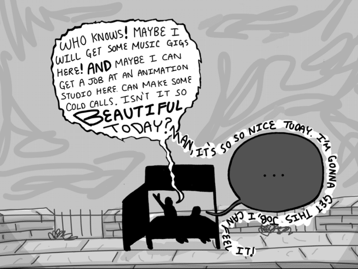 My favorite examples of this are the conversations with his ex, labeled on his phone as “I Miss Her.” Lindell’s mania manifests here in the way certain people in relationships can have a vice grip on your mood, the way a text back or lack thereof can define your whole day. His mood swings are drawn in humorously animated sequences that capture both the highs, lows and general absurdity of being in that position. Lindell’s greatest strength here is the ability to see the past with clarity, and present it to the reader with a sense of humbleness and approachability.
