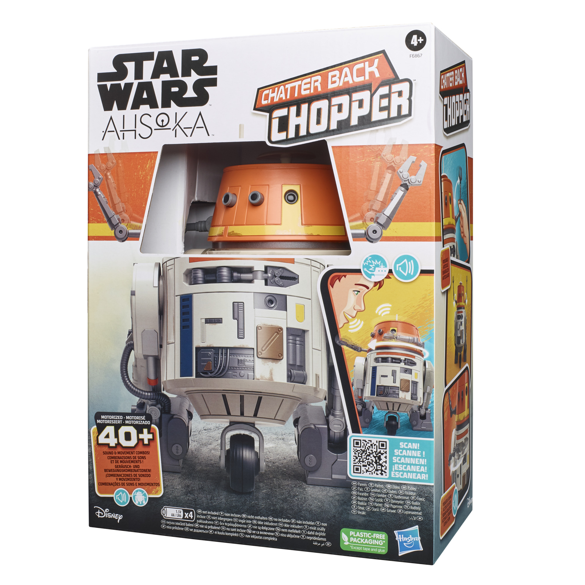 Bring the fan-favorite droid from a galaxy far, far away right into your home with this STAR WARS: CHATTER BACK CHOPPER ANIMATRONIC. This 7.5-inch-tall animatronic edition of the beloved and cranky droid toy features character design and weathered deco inspired by the STAR WARS: AHSOKA live-action series on Disney+. Unleash his sassy personality and unlock more than 40 sound and movement combinations by pressing the button on Chopper’s body, posing his front arm, or by making sounds of your own! This interactive toy responds to background noises like talking, clapping, or music with different combinations of droid sounds and motorized movements. Watch as he really responds with different sound effects and movements with his arms, body, and head!