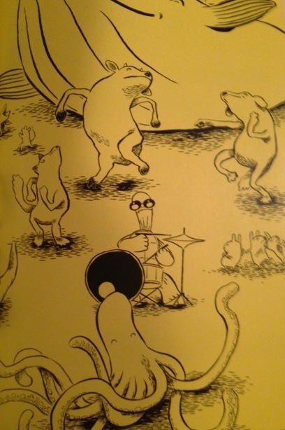 “Turtle, Keep it Steady” began as a project that Lambert completed for the Center for Cartoon Studies, and stands out centrally in the book partly due to its bold yellow background and largely one-panel per page structure. It’s a retelling of the classic fable of the Tortoise and the Hare, and features anthropomorphic animals as musicians, but triumphs in rendering the tale modern through detail. One of Lambert’s most effective techniques here is using vertical line patterns to represent musical tones, contrasting the Tortoise’s measured balance between heavy and lighter rhythms and the Hare’s increasingly erratic, booze-fueled and darker tones. It’s a story that could be told in hundreds of pages of prose, but Lambert presents the most basic elements of the Hare’s rise to success and final breakdown in instantly recognizable terms while the zen-like Tortoise wins the day, or in this case, life journey. Lambert reserves a double-page spread, breaking free from panel constraints, for the most satisfying element of the tale, the Tortoise’s enduring success as a musician. Exuberant, dancing animals crowd the pages, benefiting from the Tortoise’s upbeat message. The story couldn’t be more “human” despite its animal-based competitors.
