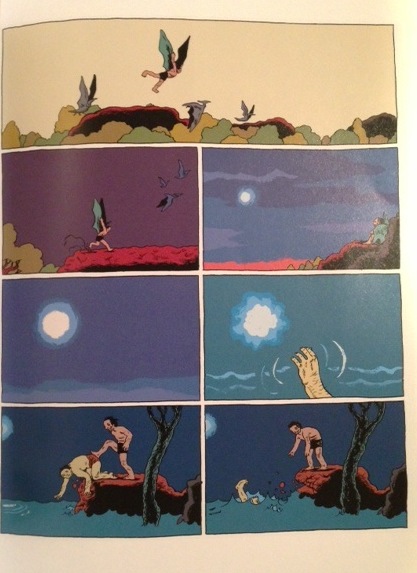 One larger sequence within I WILL BITE YOU may hint at future directions for Lambert’s visual narratives. Like several of the other comics in the collection, “(Caveman)” features a pair of characters who are both competitive and companionable, but Lambert launches into full color panels and multi-panel layouts. The results are impressive, and impact the narrative by placing his caveman duo as smaller entities within a larger, harsh environment. Like the sun and moon in “I Will Bite You”, one character suffers the loss of the other, and engages with grief on a cosmic scale, receiving some form of consolation from the universe before moving on with his life. It’s a silent comic that seems to willfully cast off written language, and there’s a strong emphasis on the beauty as well as the danger of a threatening and ecstatic environment. Lambert appears to be pushing his storytelling onto a wider canvas and into even more universal features of human experience.