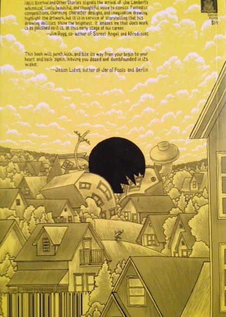Though I attended MoCCA Fest 2012 where I WILL BITE YOU debuted, it went under my overwhelmed radar, but fortunately, it caught my attention at the Brooklyn Comics and Graphics Festival. Several people who saw me carrying my copy commented on what a worthy book it was, and that I certainly ought to read it. It made its way into my holiday travel bag and once I flipped it open, I read the entire work without particularly intending to: it’s just that engrossing. This is Joseph Lambert’s first full-length book, though it contains a number of compilations from previously award-winning strips and sequences. Lambert, a graduate of The Center for Cartoon Studies, had been preparing this compilation for several years, and its final release by Secret Acres was much anticipated.