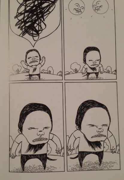 Lambert’s title piece, “I Will Bite You”, originated as his first mini comic back in 2006, but it’s position in the collection suggests a stage-setting role and continuity in his work as a whole. The movement of the narrative seems circular, but actually introduces a satisfying, and intriguing, element of change by the finale. Action plays out in two threads, one depicting an angry character below (represented by dark brushstrokes in a speech bubble), and the other the harmonious relationship between two sun-like globes above (shown with faces). As the angry character goes on a tirade, biting chunks out of winningly odd amorphous creatures, his mother, and finally one of the smiling globes above, the initially unphased globes finally face the widespread wrath, and wholesale destruction of the earth ensues. When the dust settles, the globes have been separated, seemingly into a sun and moon isolation, and the wrath of the angry figure finally elicits sympathetic disharmony from the moon. The indifference of the cosmos has been altered, albeit through violent methods. Lambert has charted the path of change, but leaves readers questioning whether the change is, in fact, positive.