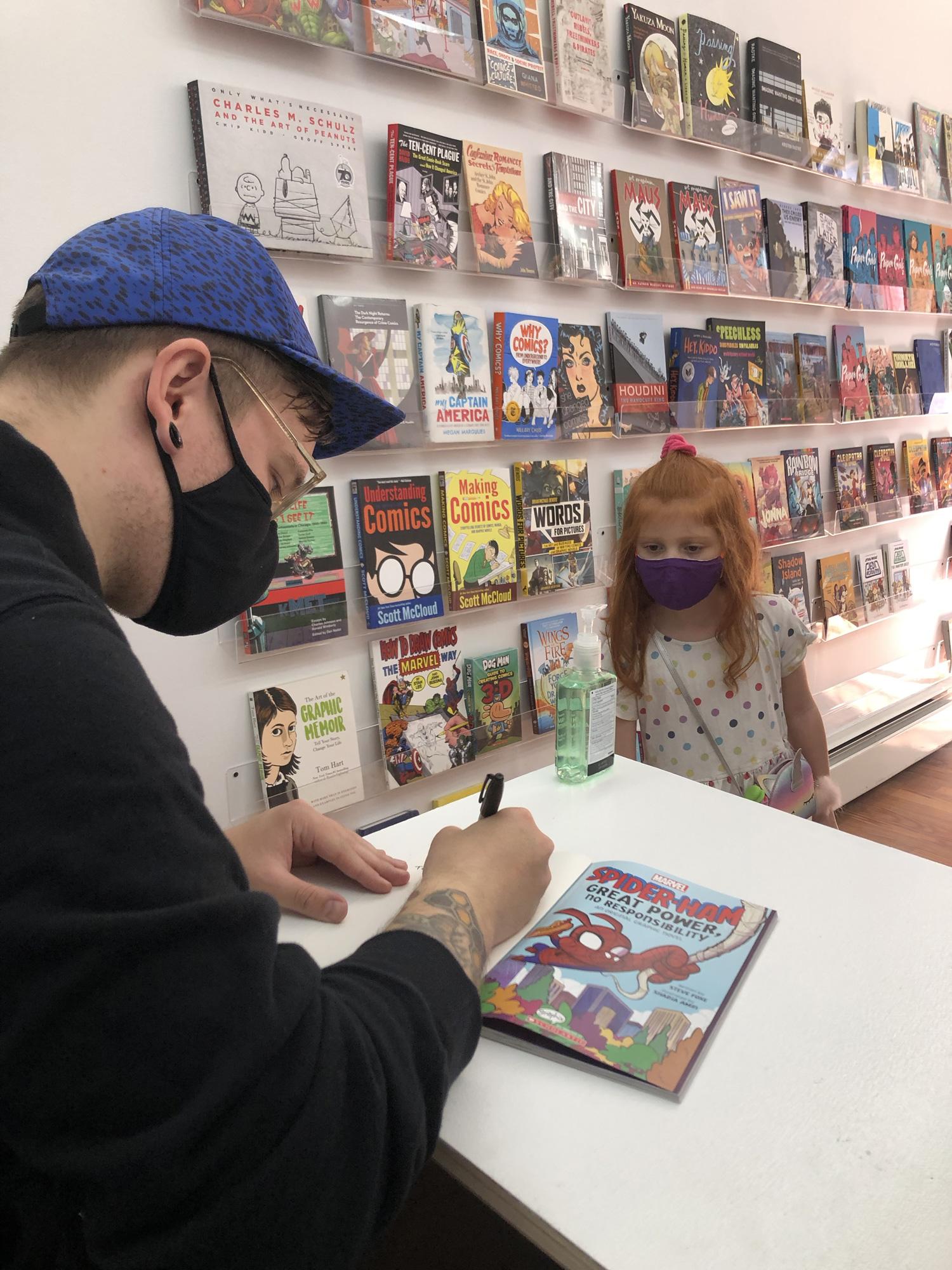 We had a blast! We would spend the day talking about comics with children and grown ups alike, recommending our favorite books, and getting schooled by neighborhood kids on what they did and did not like. In between customers, I’d sip coffee, read books, and watch the world go by. I remember this feeling of bliss washing over me the day it struck me that selling books was the most honest line of work I’d ever been involved in. I mean, I pick out some books that I think people might like, and if someone walking by does in fact like them, they give me more money than I paid for them and we’re both happy about it! Plus, there are no meetings! I felt like I had won at life.