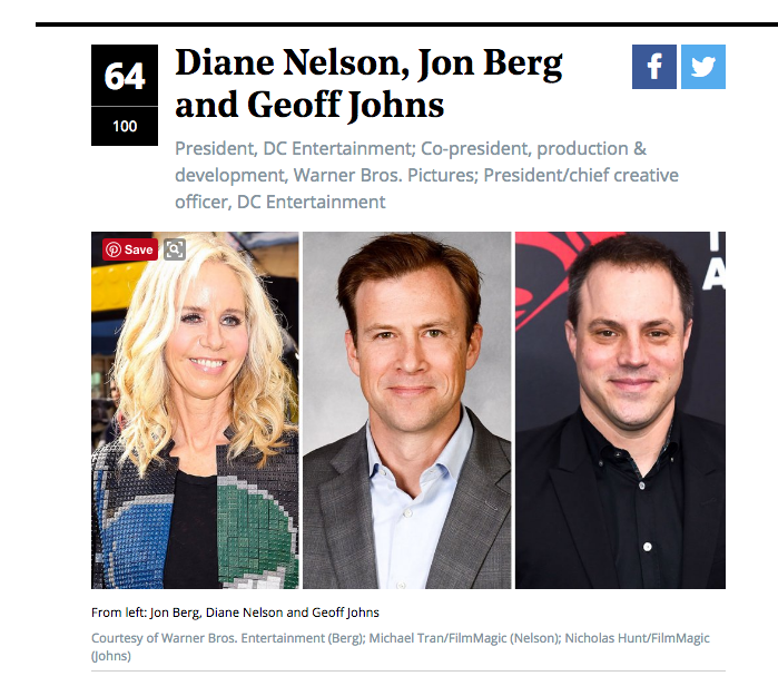MEANWHILE, THR has unveiled its Top 100 Most Powerful People in Hollywood rankings, topped, as usual, by the head honcho at Disney, Bob Iger. The Diane Nelson/Jon Berg/Geoff Johns troika comes in at 64 with some comparative statements that reveal mutual admiration at a healthy level, and Nelson taking th ebold stand of liking Wonder Woman: