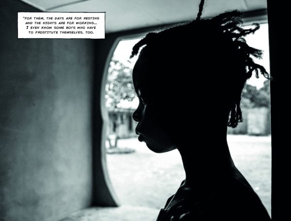 These narrative sections built of Kassaï’s sequential work are accompanied by Ellison’s photography, which offers portraits of the kids and others who are featured in the comics and sometimes bleed into the narrative, with word balloons following into the photos and back to the comics. It’s an effective addition since, as effective as these works of comics journalism can be, the fact that these stories are communicated through drawings sometimes creates a buffer zone between the real situation and the reader at home. It’s hard to see the real person through an illustrator’s interpretation, and there is a safety in that for the reader. With Ellison’s photos, it’s much harder to sink into this dissociative relationship with the subjects of the book. That’s their actual eyes staring at you, their ravaged bodies right there in total honesty.