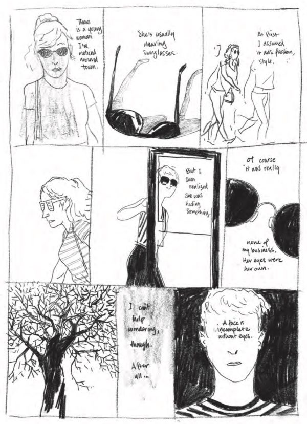 In many ways, In Pieces has the form of a diary comic, but it’s lacking in the visual shorthand that accompanies so many of those and I appreciate that. As the book begins, Ankeny clarifies that the full page drawings — the ones of actual scenes in Ipswich — were drawn on location while the comics pages were done in reflection of the moments they portray. Regardless, they work well together, the full page images providing context that makes the comics feel like you’re focusing in closer with a microscope. And the styles between them are pretty similar, black and white line drawings with the comics being looser and having an “in the moment” quality that adds to the portrayals, while the full page images are more studied, more intricate.
