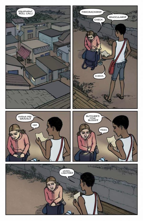 It’s in Little Girls that the Nandi Bear makes its glorious return to the comics pages, in which we are taken to Harrar, Ethiopia, a walled city that has become well-known for the tradition of feeding hyenas that has become a tourist attraction. That particular activity is featured in Little Girls, as seen through the eyes of Sam, who lives with her dad and is new to the city.