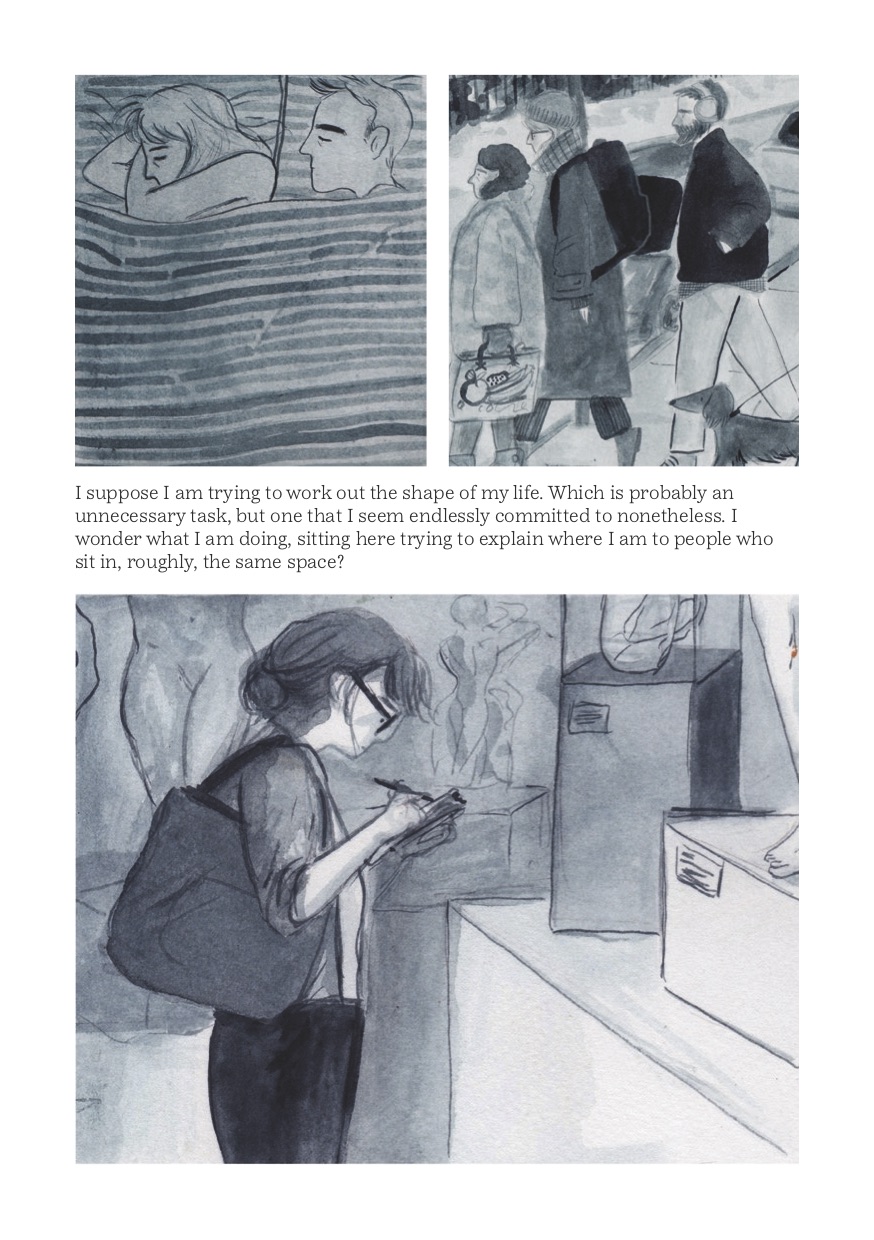 Walking Distance is not about being trapped in that house with that crow, though. It’s about being free of that house and that crow and confronting that situation on your own terms. It’s about walking specifically, and Stewart uses a prose and illustration format to investigate her relationship with that action within the London area.