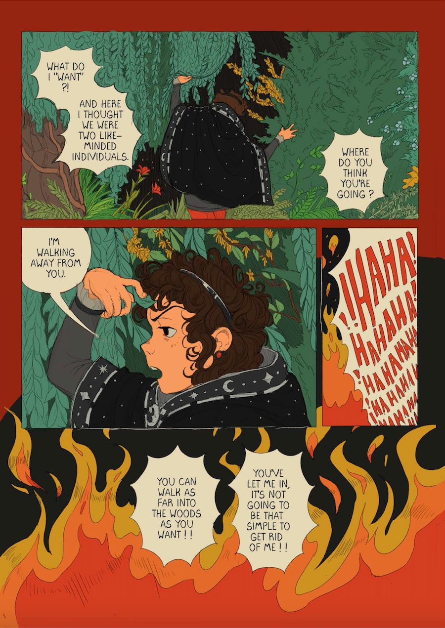 H.A.: Overall, I wanted the story to be fun and exciting, but I also had a desire to express and deal with emotions relating to coming out and transitioning in your 20s, which aren’t always fun. Figuring out how to write about and express feelings related to like, sexual trauma, feeling socially ostracized, not being sure how to be a person and etc, and having the overall narrative feel comforting to those issues, without it feeling like I was just tossing in random heavy topics into this otherwise silly story, took some experimenting and planning.
