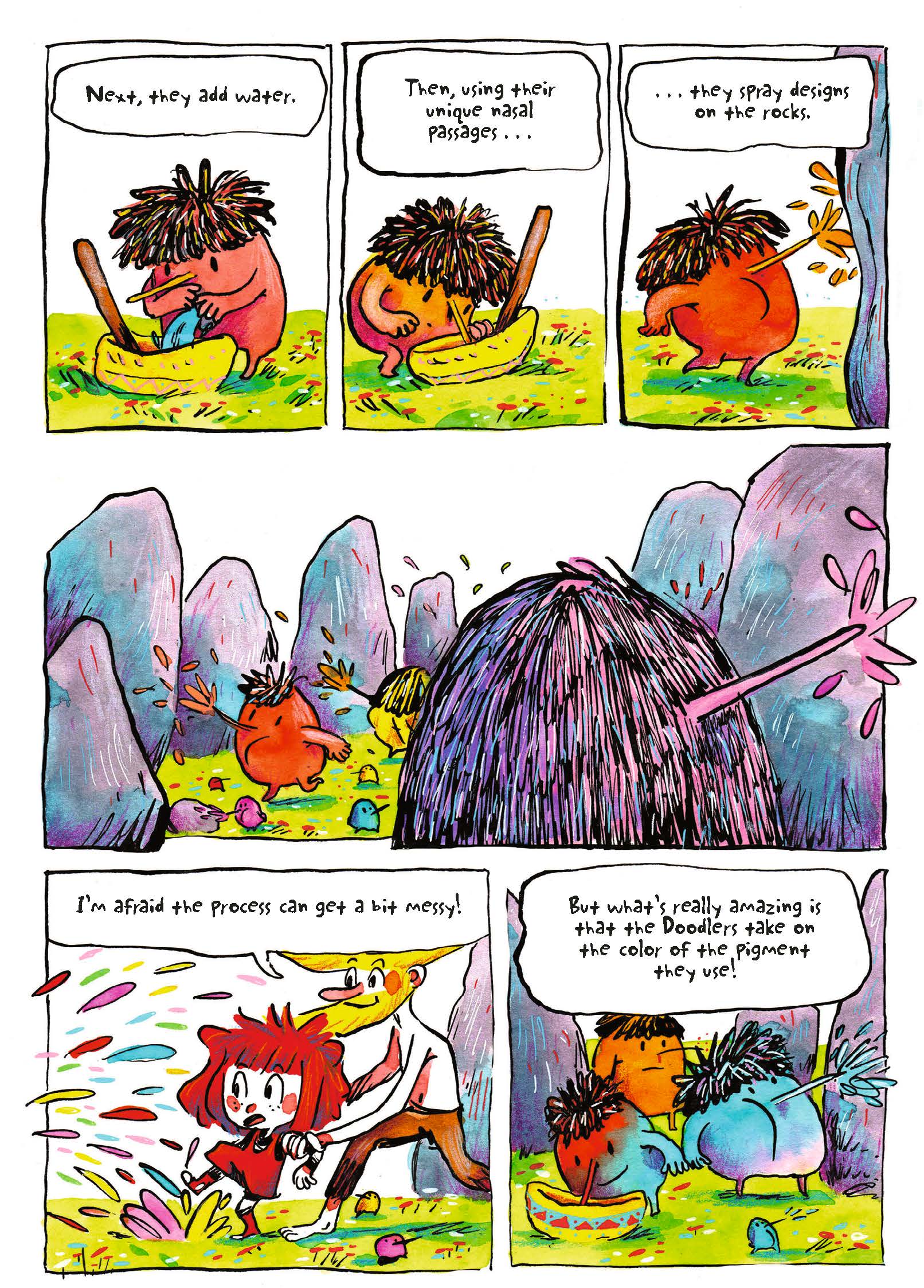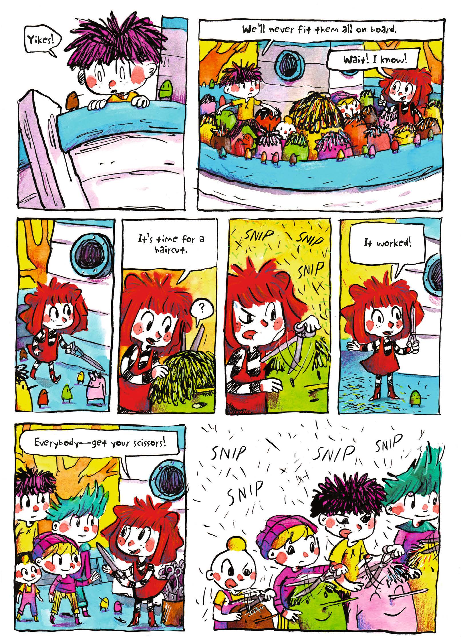 Troïanowski: I love the doodlers too. Like the plot of the story, first there’s a basic idea for the characters – they were classic inhabitants of a desert island. Then little by little, their characters grew and got more interesting and original; how could they be special? Making them paint with their noses let me nod at painters and art in general. And then there was the challenge at the end of the story, when the doodlers have to leave their island – how would they all get in Robin’s boat? From that came the idea of shrinking based on hair size – that’s basically how ideas come together when you’re making characters!