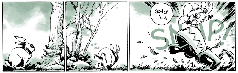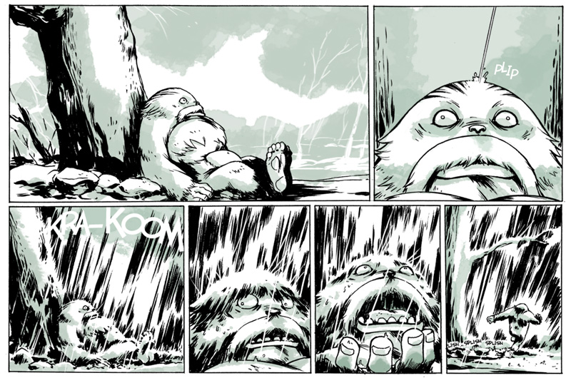 When I was in Toronto sharing a studio with a bunch of comics peers (Cameron Stewart, Ramon Perez, and Andy Bellanger) we had decided to do some webcomics as a collective to kind of take a break from our superhero work. We were all coming up with new ideas to do in this new medium and I had written out a long story that I was going to write out completely and tackle in a very standard three act structure and for some reason when I was commuting to work my mind started wandering and I had the idea for a woodland setting and a silent goofy sasquatch character surrounding by wisecracking animals. I hadn’t intended to do it as a comic; it was just something that was amusing to me. When I drew a picture of it I just kind of kept going and it didn’t stop from there. I like it because it lends itself to a weekly format and I can kind of play with different ideas on different weeks depending on my mood. And I’m not really attached… well I guess I’m attached to an overall story now, but for the most part I can just explore different facets of the characters or different facets of myself and have fun with it on a week to week basis.