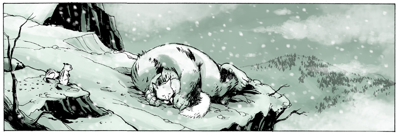 I think hunting’s part of the reason I’m so fond of animals. I know that sounds crazy, but I walk in the woods with them a lot and look at deer tracks and moose tracks and try to spot rabbits and wild turkeys and coyotes… I don’t have a problem with it because I think it’s an ethical way to get one’s meat. I’m not a vegetarian but I mostly don’t eat a lot of meat unless I know where it came from and its either from a local farmer where the animals have been treated well or it was hunted by my dad, so the only meat in my freezer is moose and deer meat. So no, I don’t think I have a problem with it. I guess there have been two hunting scenes in all of The Abominable Charles Christopher and it was really just to illustrate the idea that there was a threat to this idyllic scene. And I didn’t want to paint the human element as evil per se and I don’t think I have exactly. I just wanted there to be an element of danger lurking on the fringes of this forest and I think it’s balanced by the idea that there’s as much danger within the forest between some of the animal factions as there is on the outside. And I think a lot of that will be resolved as I go through the story and develop the relationship between Charles and Gilgamesh. But to answer your question no; I don’t have a problem with hunting.
