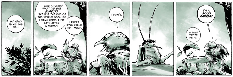I don’t think I learned it from there. I think that stuff just comes from my personality. I think the somber moments just come from trying to capture… to imbue a sense of humanity upon the characters. And the humorous moments really just provide levity both for myself and the audience. Sometimes it gets so heavy I very acutely feel that it needs to be lightened up in spots. So it’s actually difficult to collect into a book because I tend to rearrange strips here and there to make the story flow more organically and have the ups and downs occur more evenly. Some of the stuff in Chapter 2 especially gets a little bit dark. So I think it’s balanced… well, to my tastes. I can’t speak to the readers but they mostly seem to be along for the ride whether it’s happy or sad. But I don’t know where that comes from. I don’t know if I learned it anywhere. I think it’s just a method of self-expression.