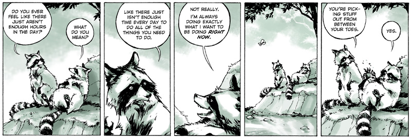Not off the top of my head. I think all writers’ characters are fragments of their egos or ids… I know that a lot of the raccoon strips usually express some sort of message of meditative compassion that’s important to me. I never want it to feel preachy but I put it in there because I think it’s an interesting point of view and it’s usually a point of view that’s not communicated often enough. Some of the early Gilgamesh strips involved speeches that he was projecting to his city that were pretty heavy handed in terms of ethical treatment of animals or lack thereof in this strip. That was very much me and that was really pushing the envelope of being preachy and I try to get away from that, but at the time I’m writing it… I can’t remember what the circumstances were surrounding the writing of the strip on those particular days, but it probably felt important at the time and I think its stuff that especially collected will start to indicate some sort of theme. Once it’s all said and done, once it’s all been completed, I think those bits of communication will stand out more as kind of a clear message among the narrative.