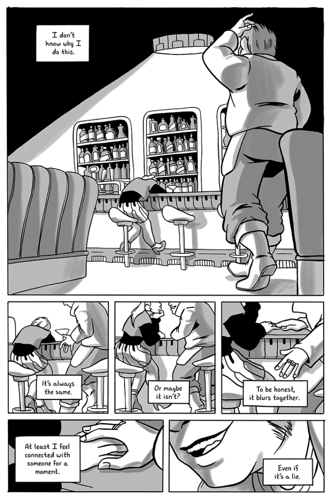 McDonald: Well, I try not to stick to just comics when it comes to influences. But for comics specifically, I think a lot about Carla Speed McNeil’s Finder. It was a big influence in how to handle world-building/structure. It jumps around to develop different parts of the world.