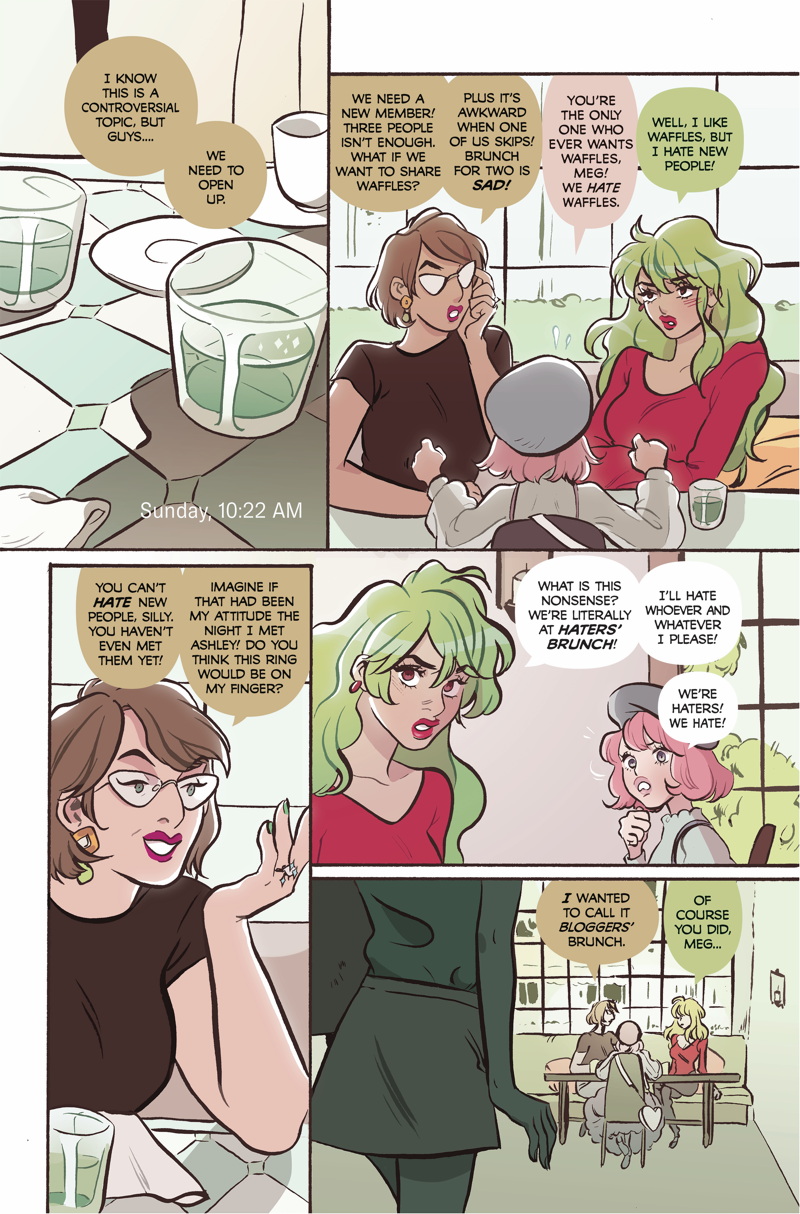 We set a foundation of what it’s like inside of Lottie’s head in the first arc. With the second, we were exploring a lot more of the intricacies of the main cast’s interpersonal relationships, from Lottie’s ongoing insecurity about her friends – especially where she stands with Caroline – to Meg’s doubts about the validity of her relationship, and Cutegirl’s ongoing battle with the flow of time. The new arc digs further into everyone’s past, including Lottie’s fraught relationship with her family, a theme touched upon in the second volume with the introduction of Caroline’s super mysterious brother, Virgil.