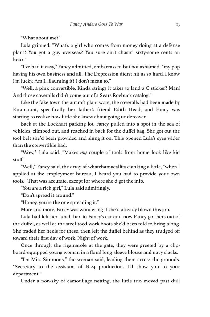 Collins: She’s something of a sidekick to Fancy in the subsequent two novellas, and so are the other women she works with at the aircraft factory, though that setting is unique to this first book.