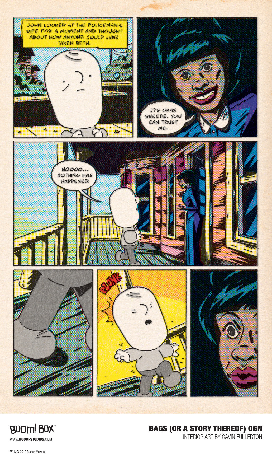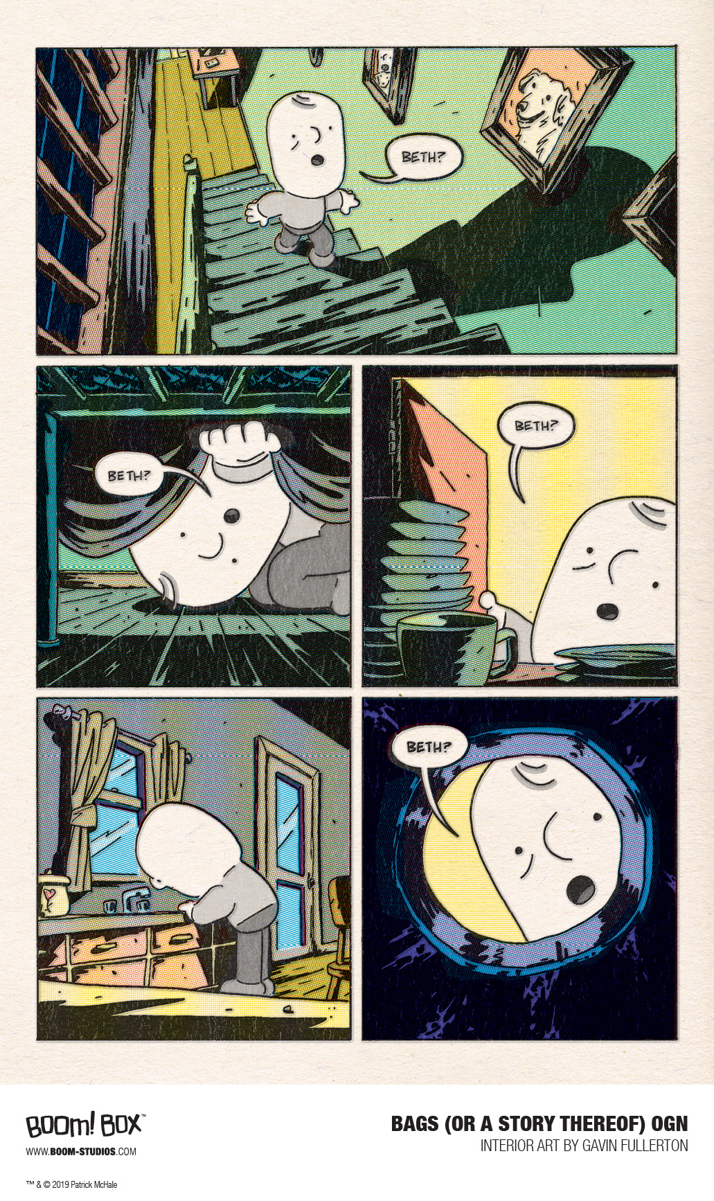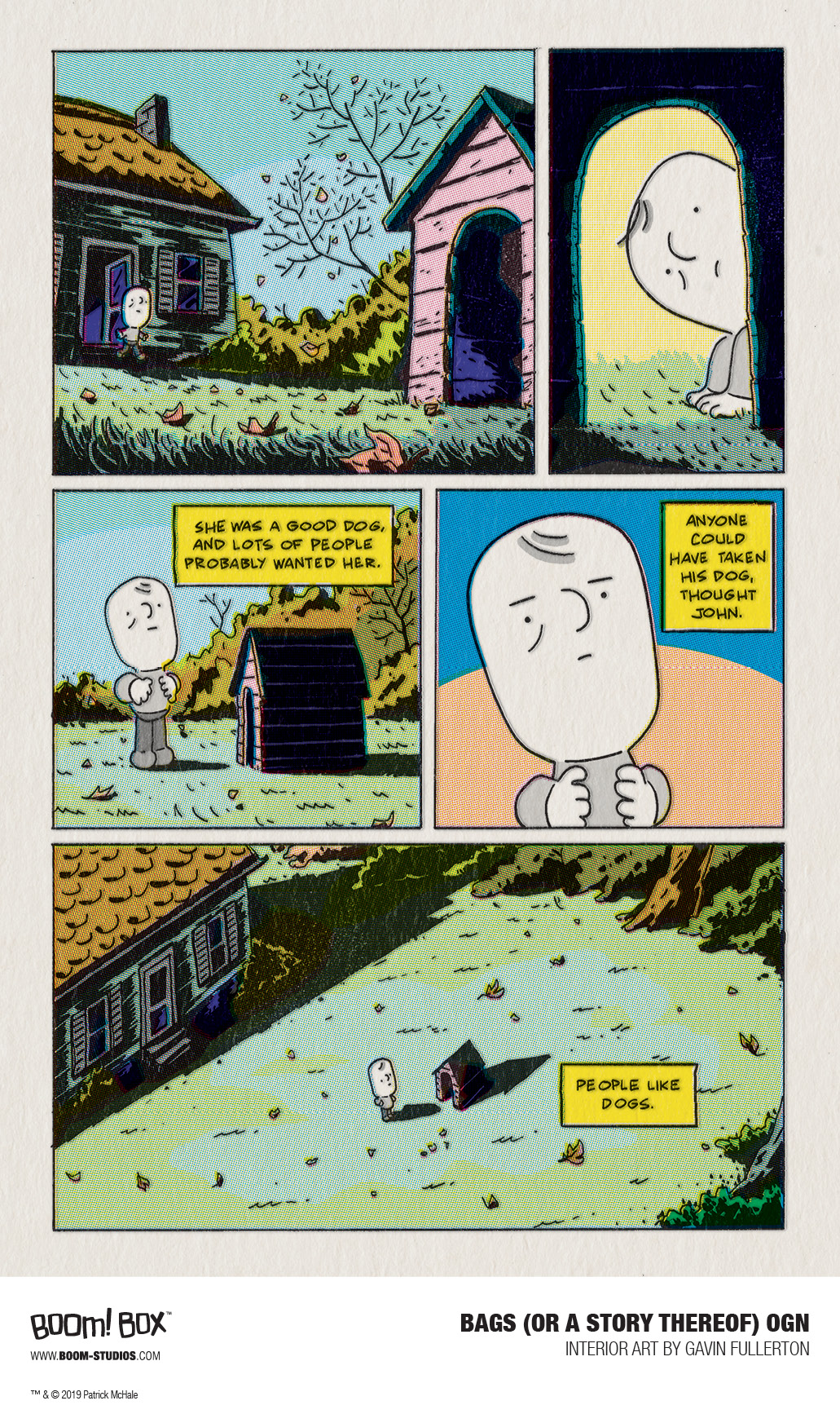 Best known for creating Cartoon Network’s iconic miniseries Over the Garden Wall, Patrick McHale has a gift for writing spooky tales with a whole lot of heart. Prior to introducing Wirt, Greg, Beatrice, and Frog to the world, he wrote a short story called BAGS (OR A STORY THEREOF), which has since been converted into a graphic novel by cartoonist Gavin Fullerton and published by BOOM! Box.