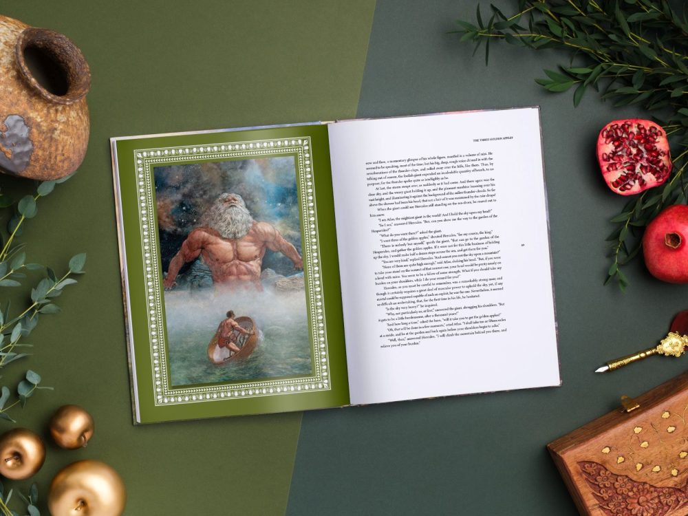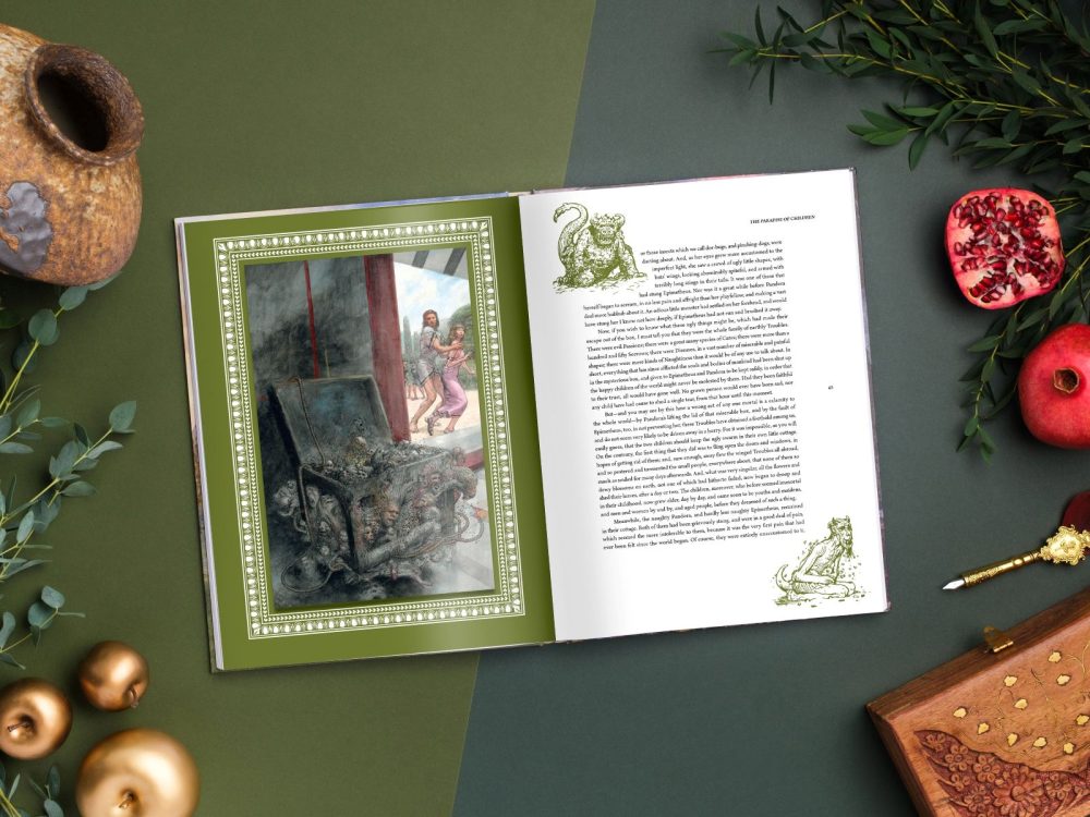 JOSH O’NEILL: I was drawn to the project out of a love of Greek myth and a love of these paintings. Das Pastoras was already working on this portfolio as a passion project before Beehive ever got involved, and when Jose Villarrubia first shared it with me, I was blown away by their scale and vision. I love the A WONDER BOOK specifically — there’s also something special about the way Hawthorne handles these ancient tales, something playful and eerie and nostalgic all at once. Pairing that with the visionary, almost mystical quality of illustrations felt like a perfect alchemy, the kind of thing we’re always trying to create with our Illuminated Editions series. And to work with authors like Jose, Guillermo Del Toro, and Kate Bernheimer, bringing it all together, was such a privilege.