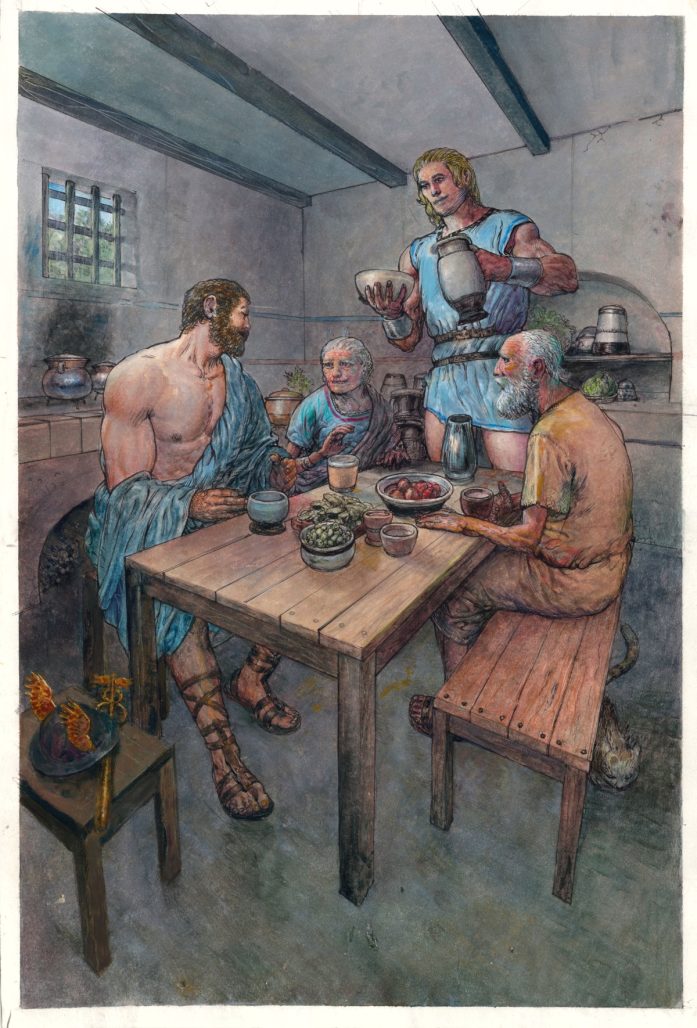 VILLARRUBIA: Pastoras is a perfectionist. Each image he paints has multiple layers of meaning. The first is their dramatic impact, thanks to his mastery of composition. But on each subsequent viewing, you notice small details that deepen the story: background elements, secondary characters, the design of the costumes, the patterns—all contributing more than just their individual parts. I could say this about any of his works, but for example, in his picture of Baucis and Philemon entertaining Zeus and his son Hermes, you initially see the scene as Hawthorne described. Then you realize he’s depicting the three ages of man—Hermes as the youth, Zeus as the mature man, and the hosts in old age. Finally, you might spot the couple’s cat under one of the benches, probably licking up a bit of the magical milk spilled from the pitcher.