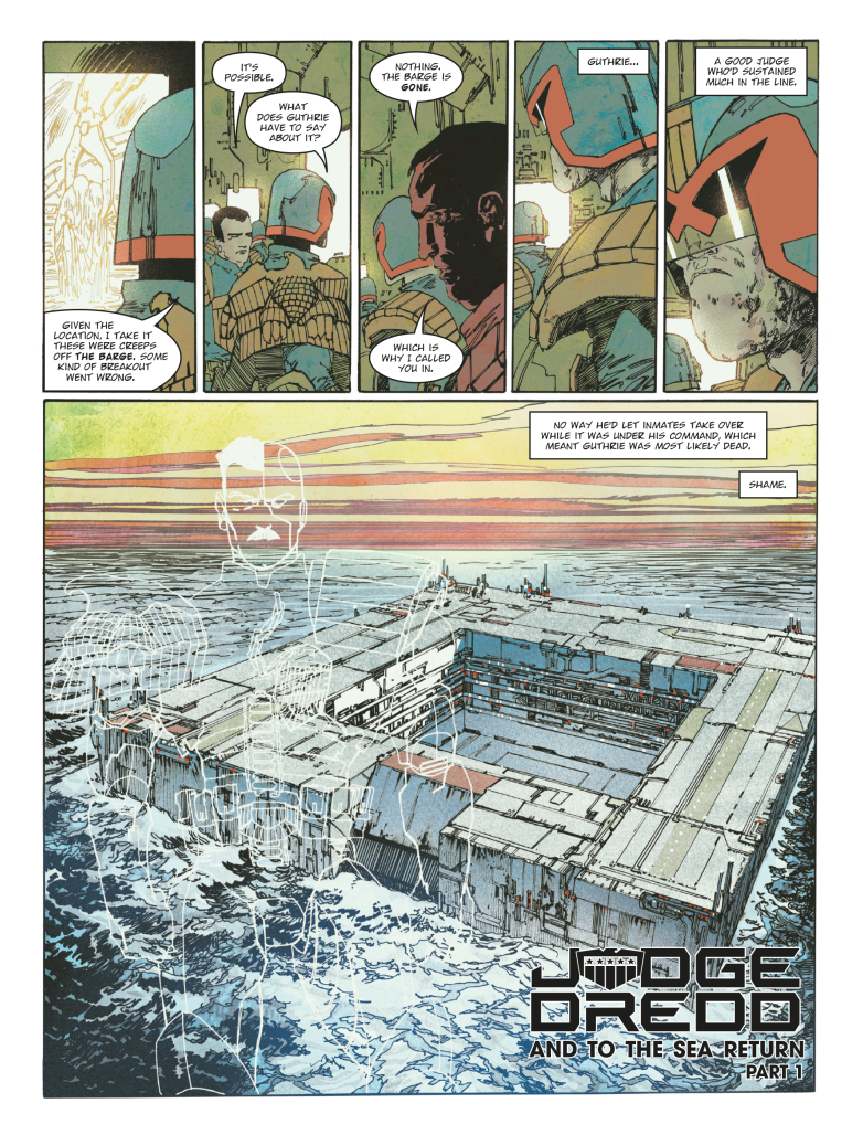 RW: I find first episodes the easiest thing to write – all the hard work goes elsewhere. You have to know what’s coming, tease it out, have a big cliffhanger – in this case a gruesome, disturbing one. I think the tough thing on episode one of ‘And To The Sea Return’ was the setup exposition scene between Judge Dredd and Chief Judge Logan.