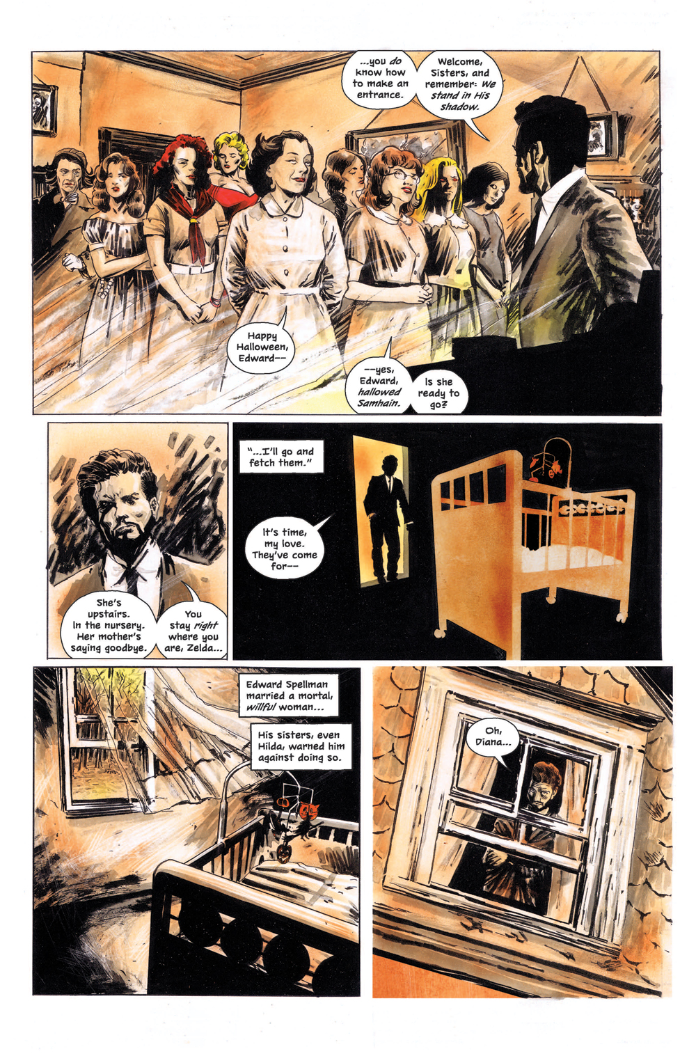 Roberto: The first arc is Sabrina’s dark origin story, from when she was a little girl to her sixteenth birthday, when she finds herself at a crossroads. After that, there will be high school stories, stand-alone stories, we’re going to explore all of her supporting cast in a deep way—Salem’s going to get his own issue, detailing how and why he was turned into the cat—the aunties are going to get the spotlight, we’re going see them as young women…