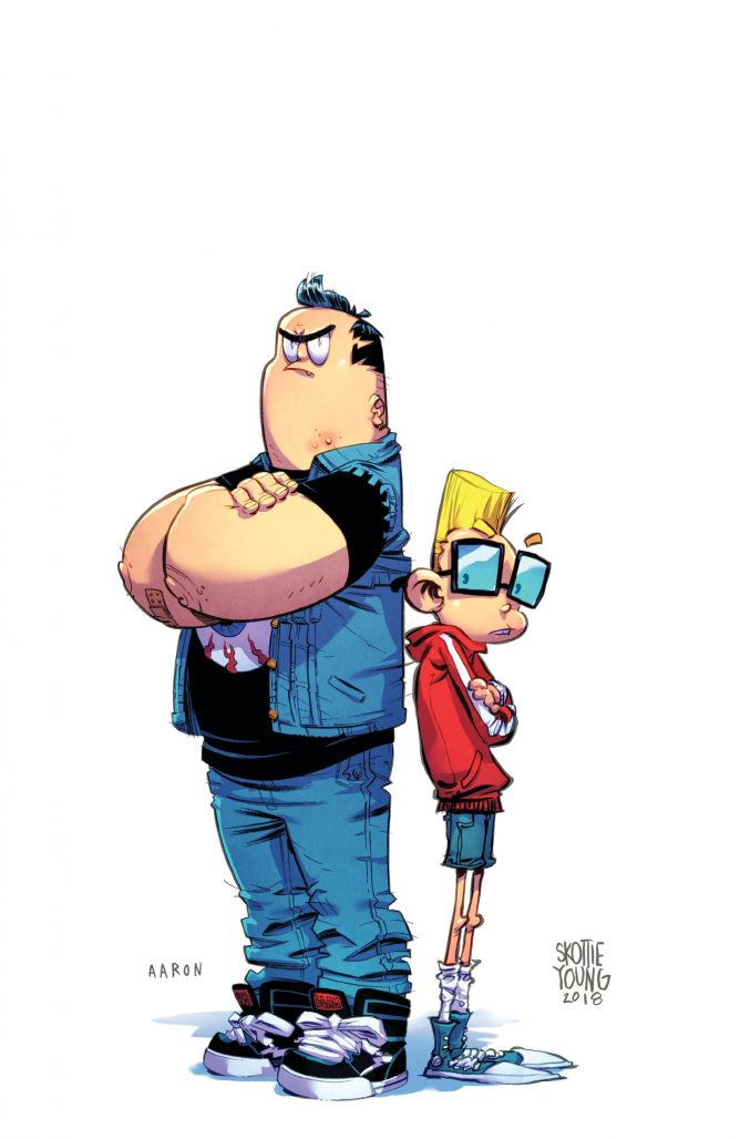SKOTTIE: Not really. That’s all Aaron. Being an artist myself, I’m pretty sensitive about making my collaborators feel like i’m going to come in and start telling them how things should look. I wanted to work with Aaron because he’s a brilliant cartoonist, not because he’d draw how I wanted it to look. So I stay in my lane! I gave a few notes on the characters ages when we first started, but past that, I’ve just watched Aaron craft a beautiful and funny world! Then Jean comes in and pluses it up even more with his electric colors! I’m pretty spoiled.