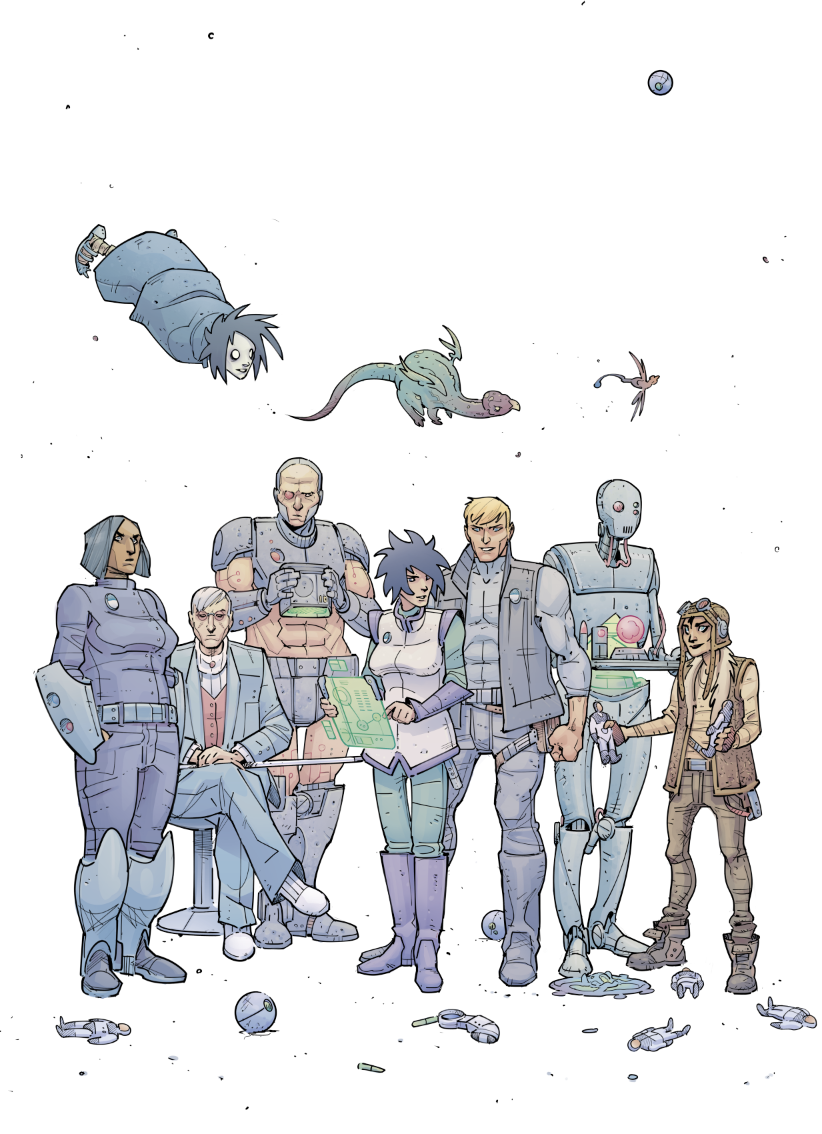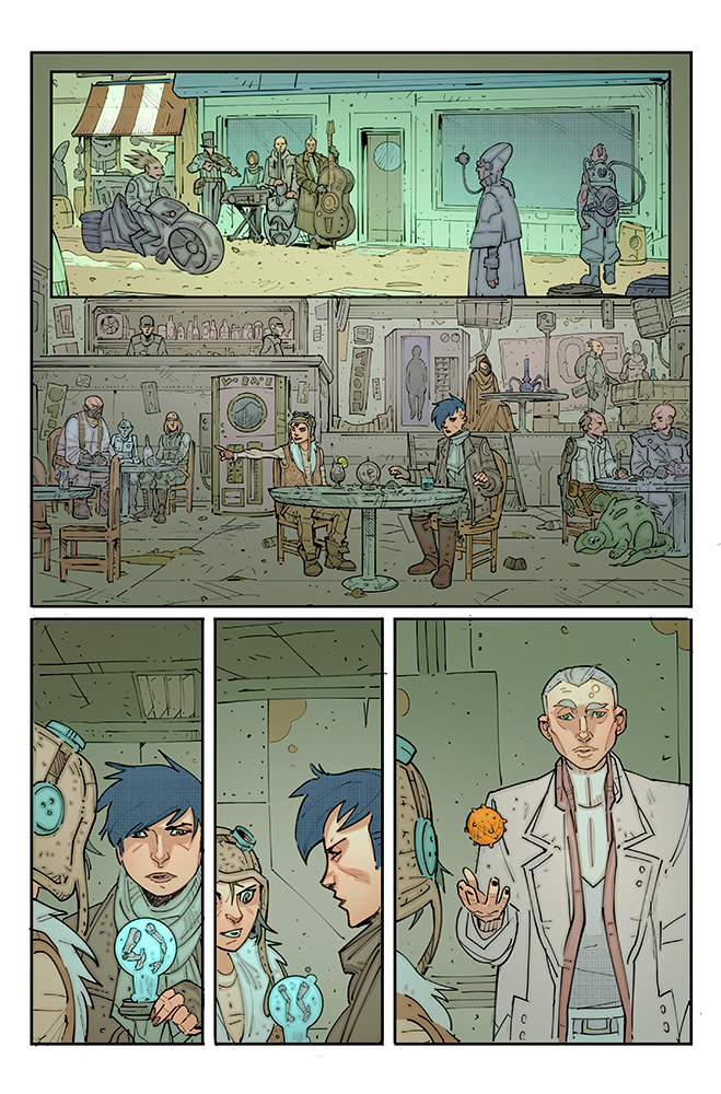 SM: So having set all that up, in this arc we’re setting up a big galactic conspiracy – a sort of invisible threat to the entire galactic economy. And in the course of investigating that, what happens is we meet a lot of new characters, and it becomes a bit of a mystery. Some combination of these characters are behind this gigantic plot, and it’s up to the two EGOs teams on two different planets to unravel and solve this mystery. So what we’re doing with the two main characters, Deuce and Pixel, they were together in the first story, but now they are completely apart. Deuce is involved in the core of the conspiracy on Earth, while Pixel is leading a stealth team on the remote, lawless planet of Tortuga with a subset of the team. So they’re off in two different places. It’s kind of weird because their relationship is still the heart of the story, it runs through every page of the book, but we’re really seeing them do their jobs here, and we’re seeing them do it separately. So it’s this weird mix of superhero and science fiction and in this story, crime drama.
