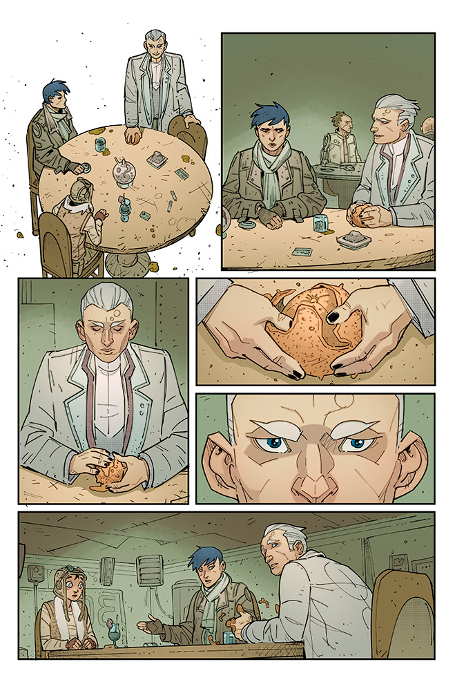 SM: That’s interesting, I hadn’t thought about it as cyber-punk, but it probably seems that way because of the noir influence. There’s a pretty hard edge to issue six when you meet some of the suriviors of the Crunch War. One of the new characters, the Commander, fought it in. What that war did to these people, and these planets, is a crucial part in where the story is going. I’m very fond of an old subset of noir that focuses on damaged WWII veterans and the crimes they committed, and it was something people were writing a lot about in the 1950’s and that influenced this story as well, but in a more futuristic context.