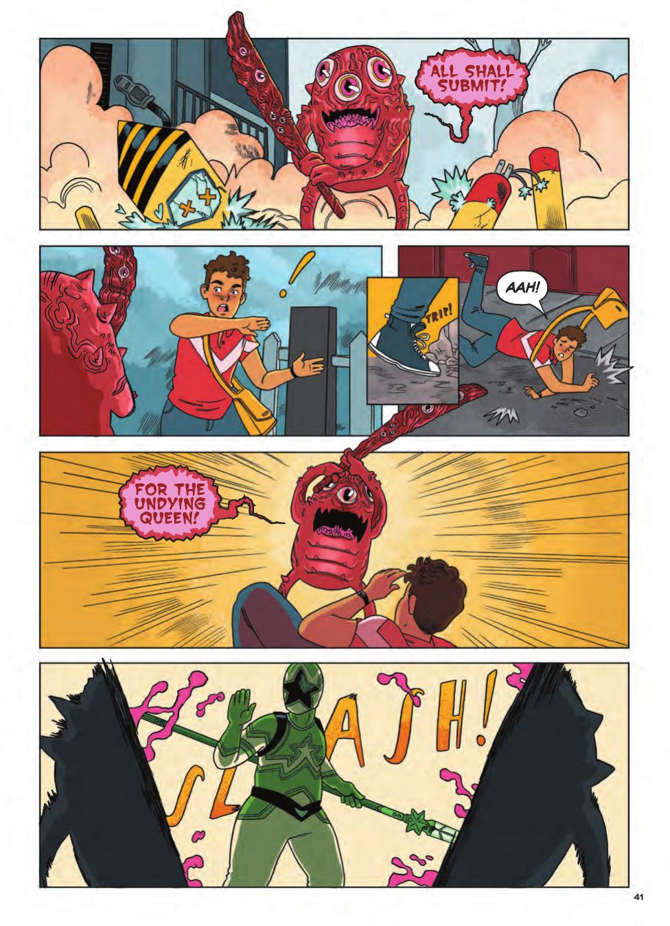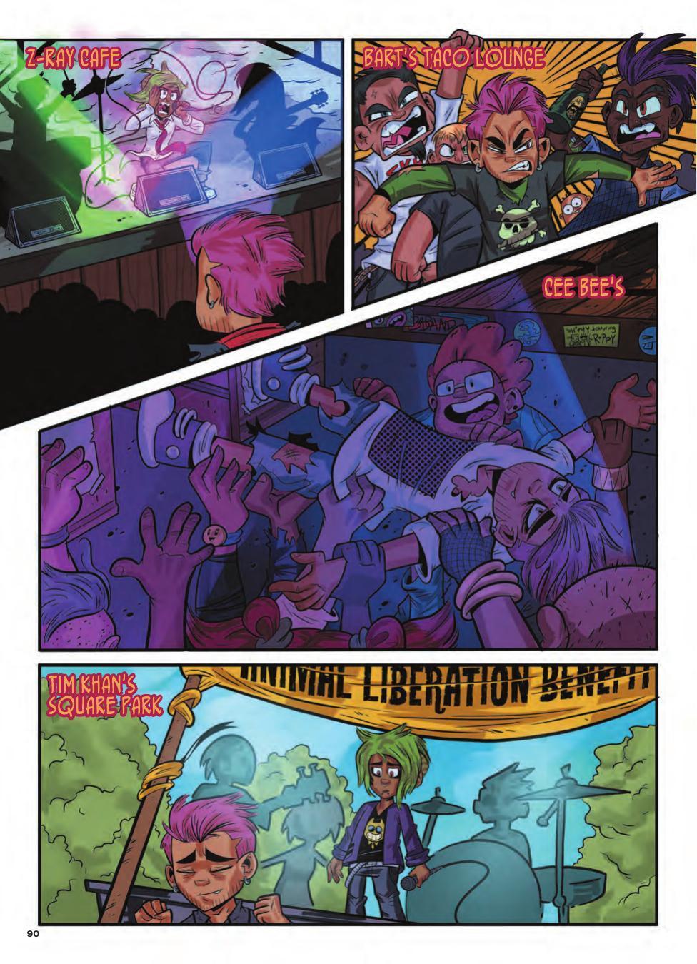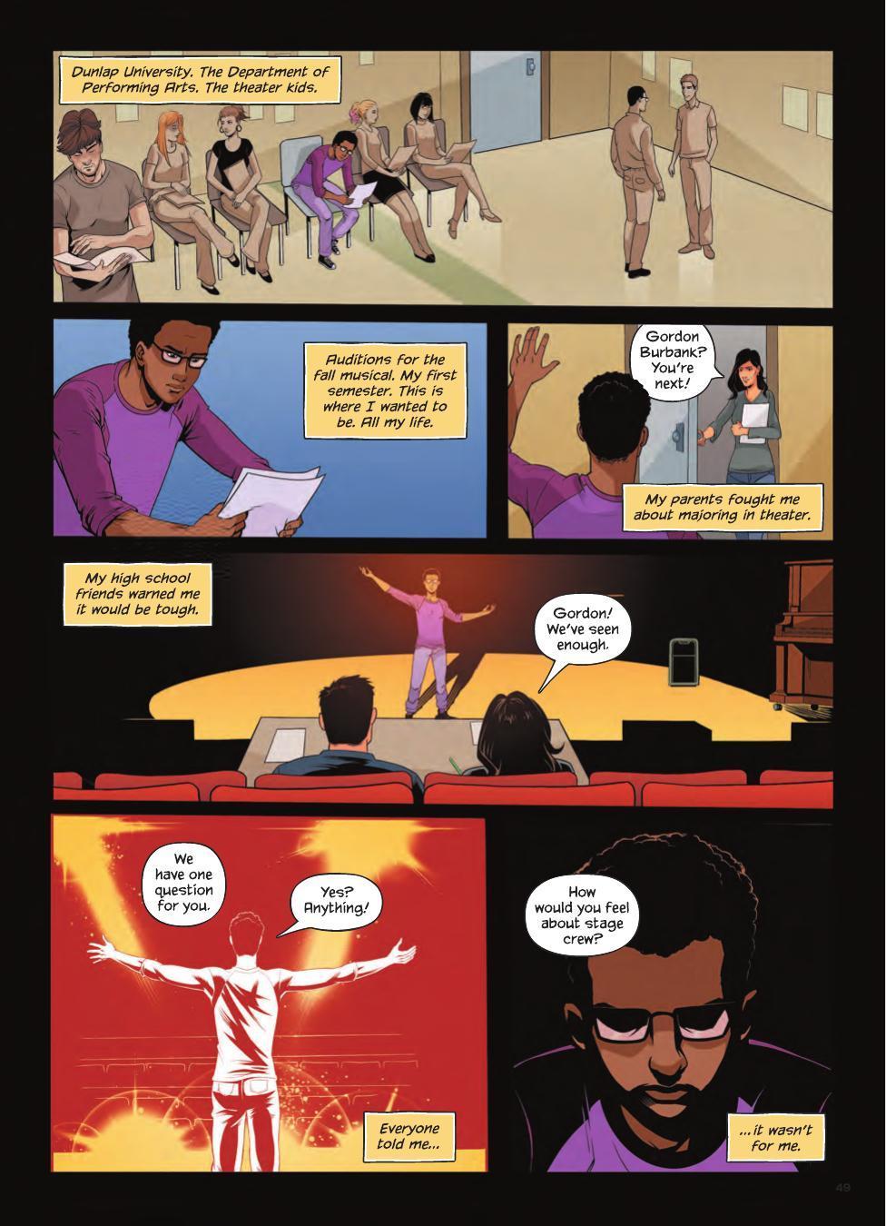 Each of the artists and authors submitted their own ideas, though some were later shifted around to avoid duplicates or stories that were too similar. When I asked if there was a common duplicated theme Minor answered immediately, “theater kids. Yeah. Surprise.” Glass later added that it was “a very common theme. I think there were four or five different [theater kid] pitches.”